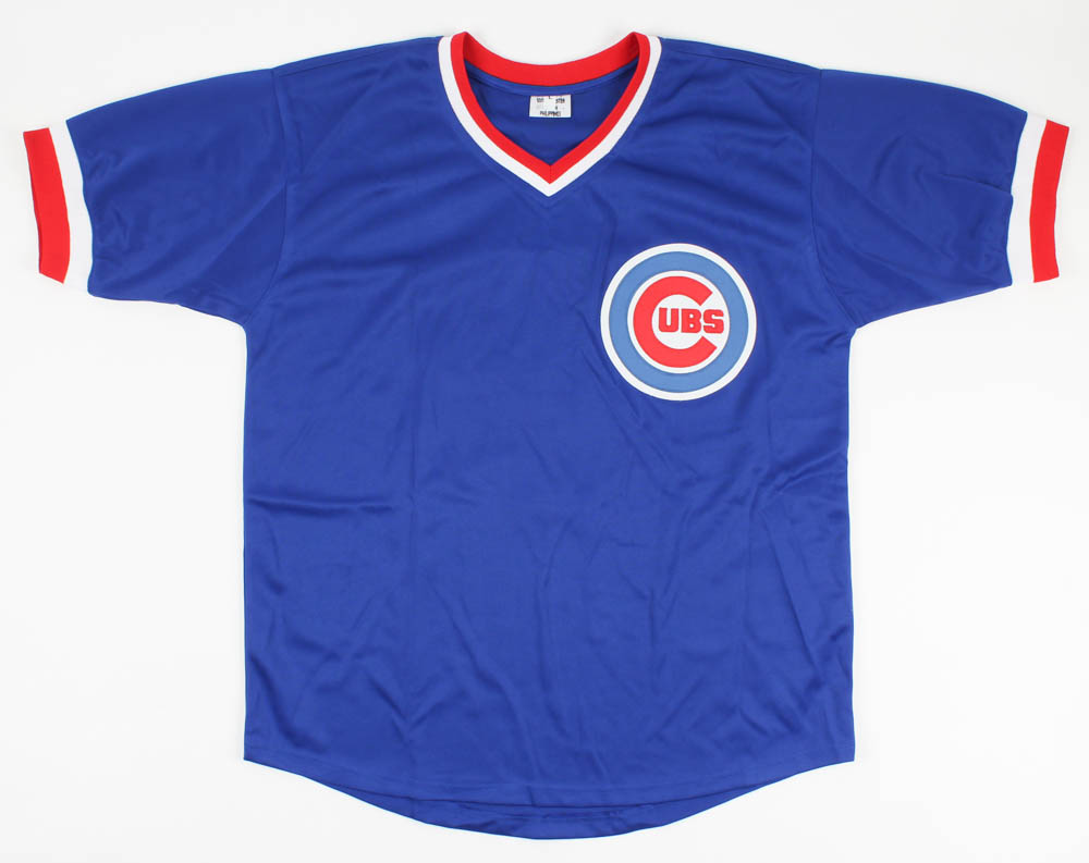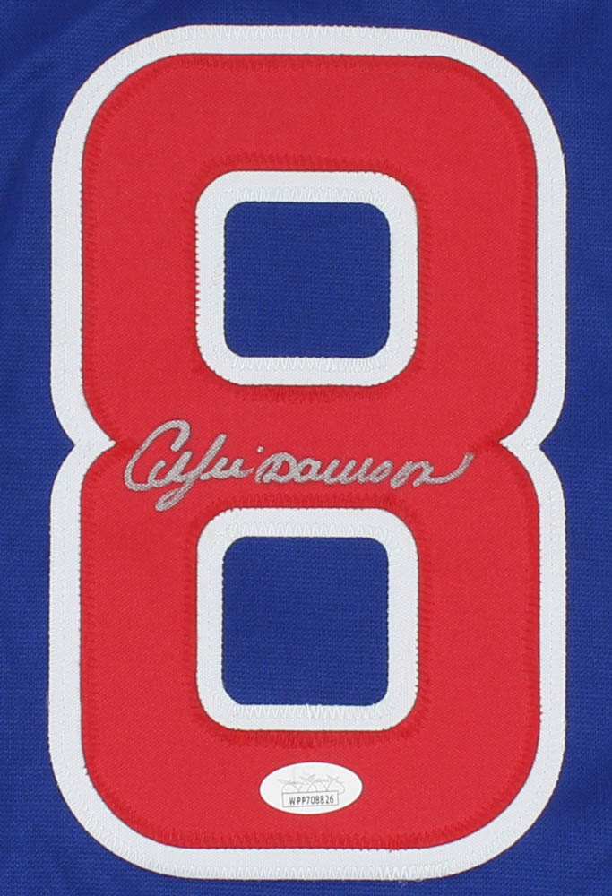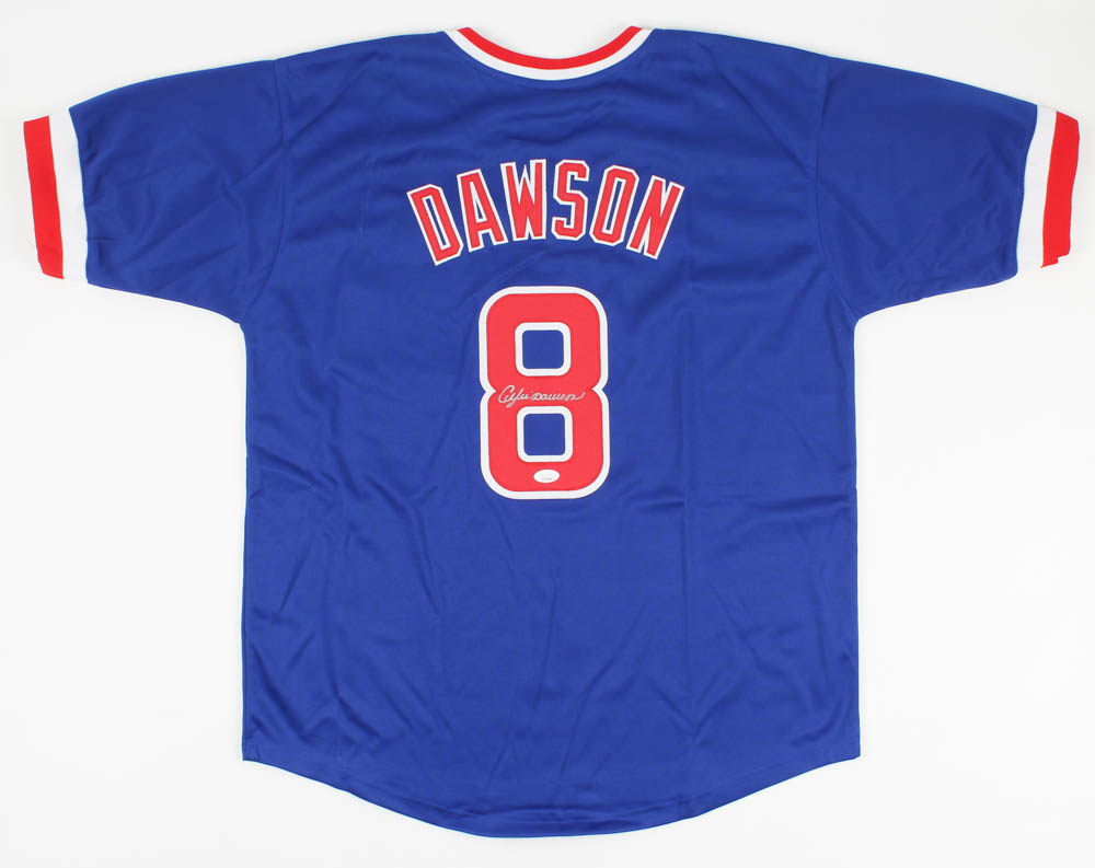 Custom on-field style jersey. Everything is sewn on, size L. Has been hand-signed by Andre Dawson (Chicago Cubs, HOF).