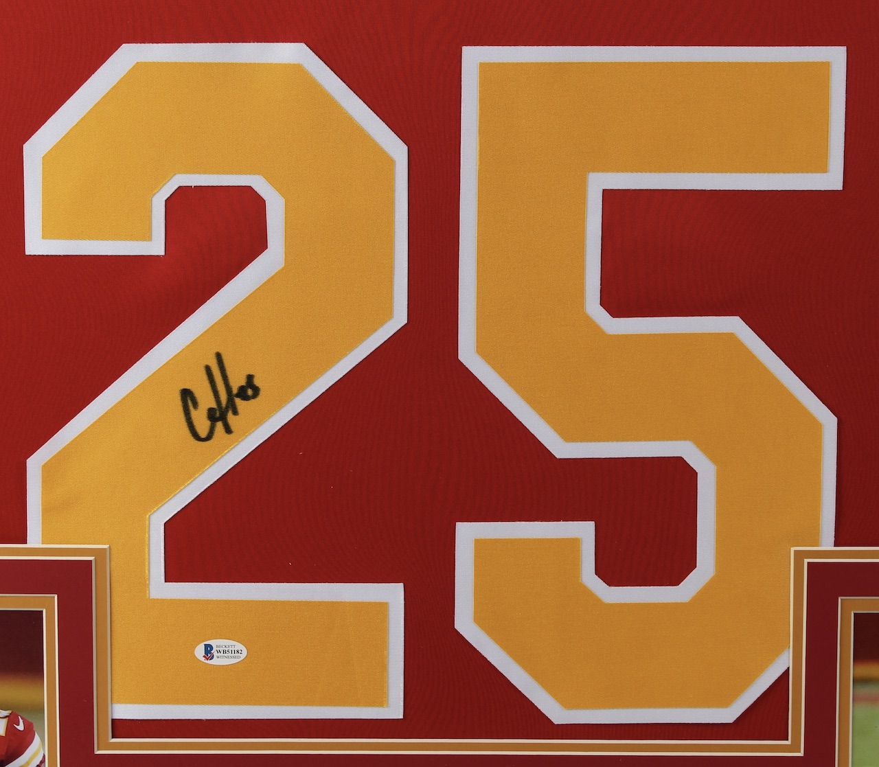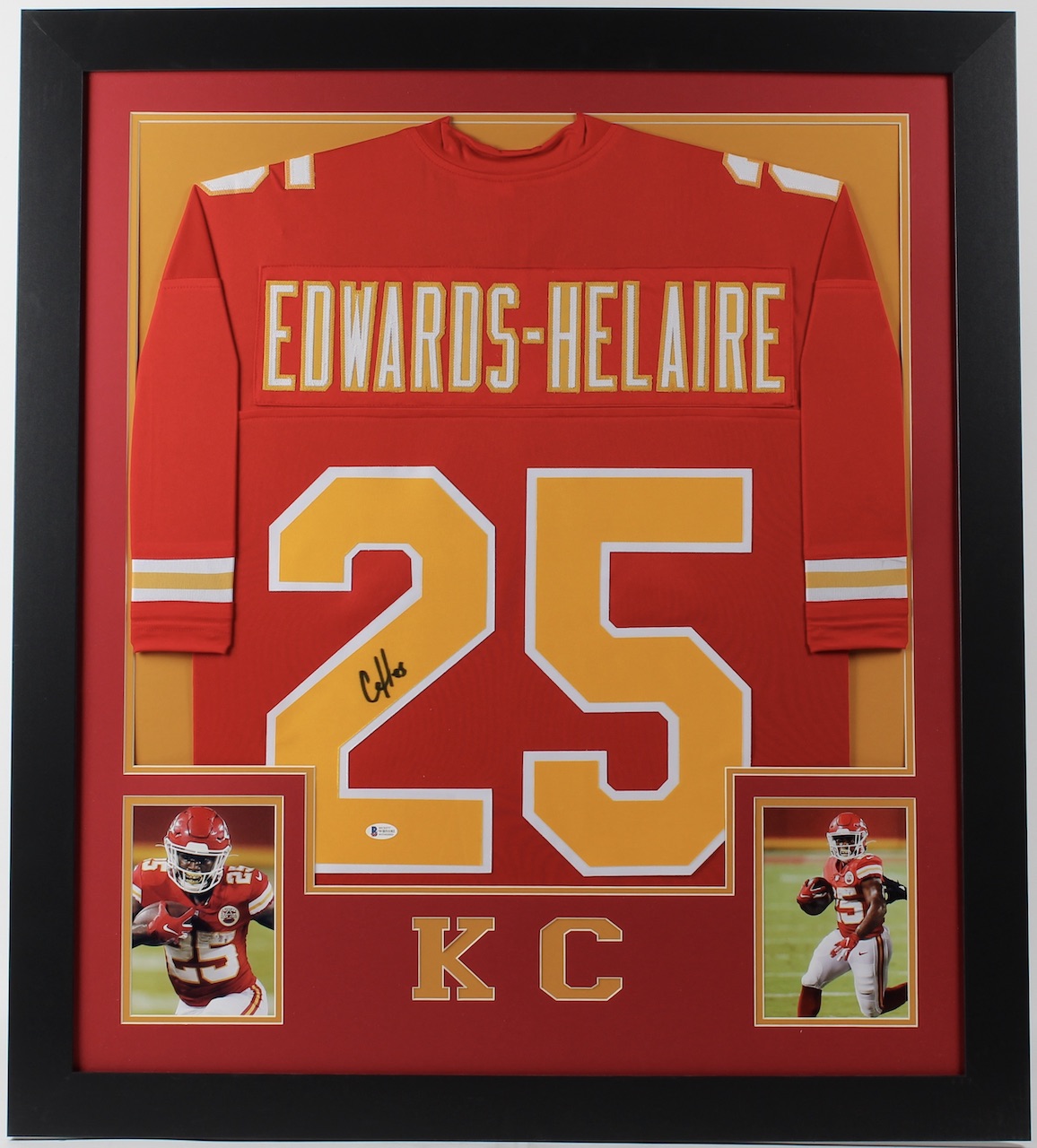 Custom frame measures approximately 31" x 35" in size and features a jersey that has been hand-signed by Clyde Edwards-Helaire.