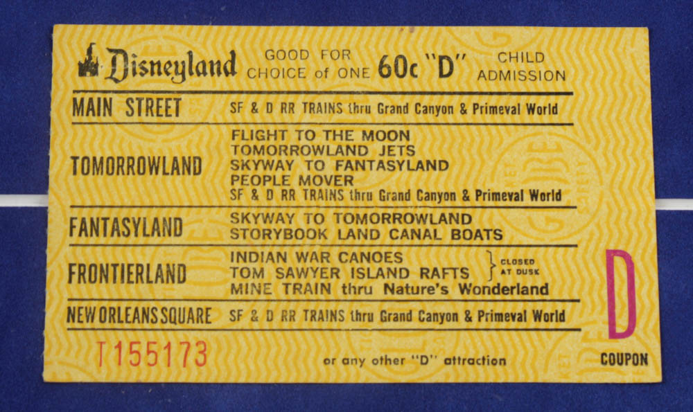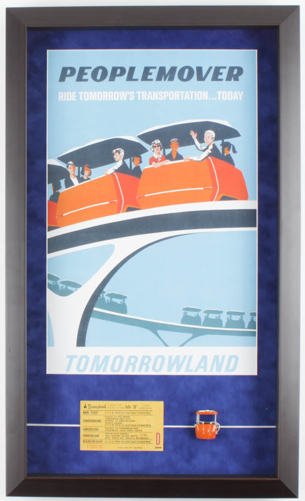 Custom frame measures approximately 14.5" x 24.5" in size and features a print of Disneyland Tomorrowland's "Peoplemover". Display also features a vintage 1960s "D" ticket and a souvenir resin "Peoplemover" figurine.