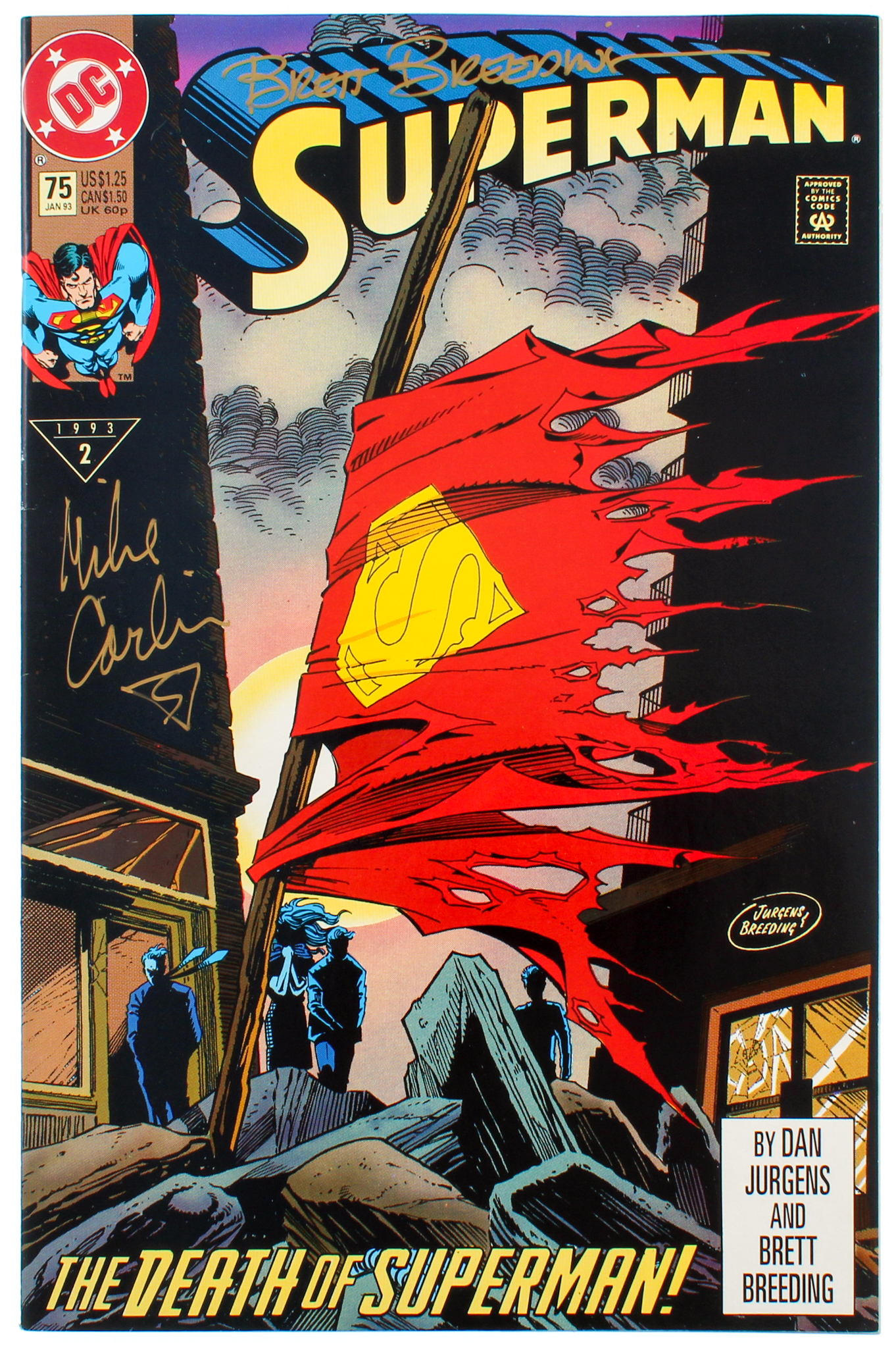 1992 "Superman" Issue #75 "The Death of Superman" DC Comic Book has been hand-signed by Brett Breeding and Mike Carlin.