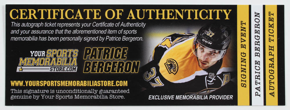 The lot / autograph(s) includes an official Your Sports Memorabilia Store Patrice Bergeron hologram and COA for authenticity purposes.