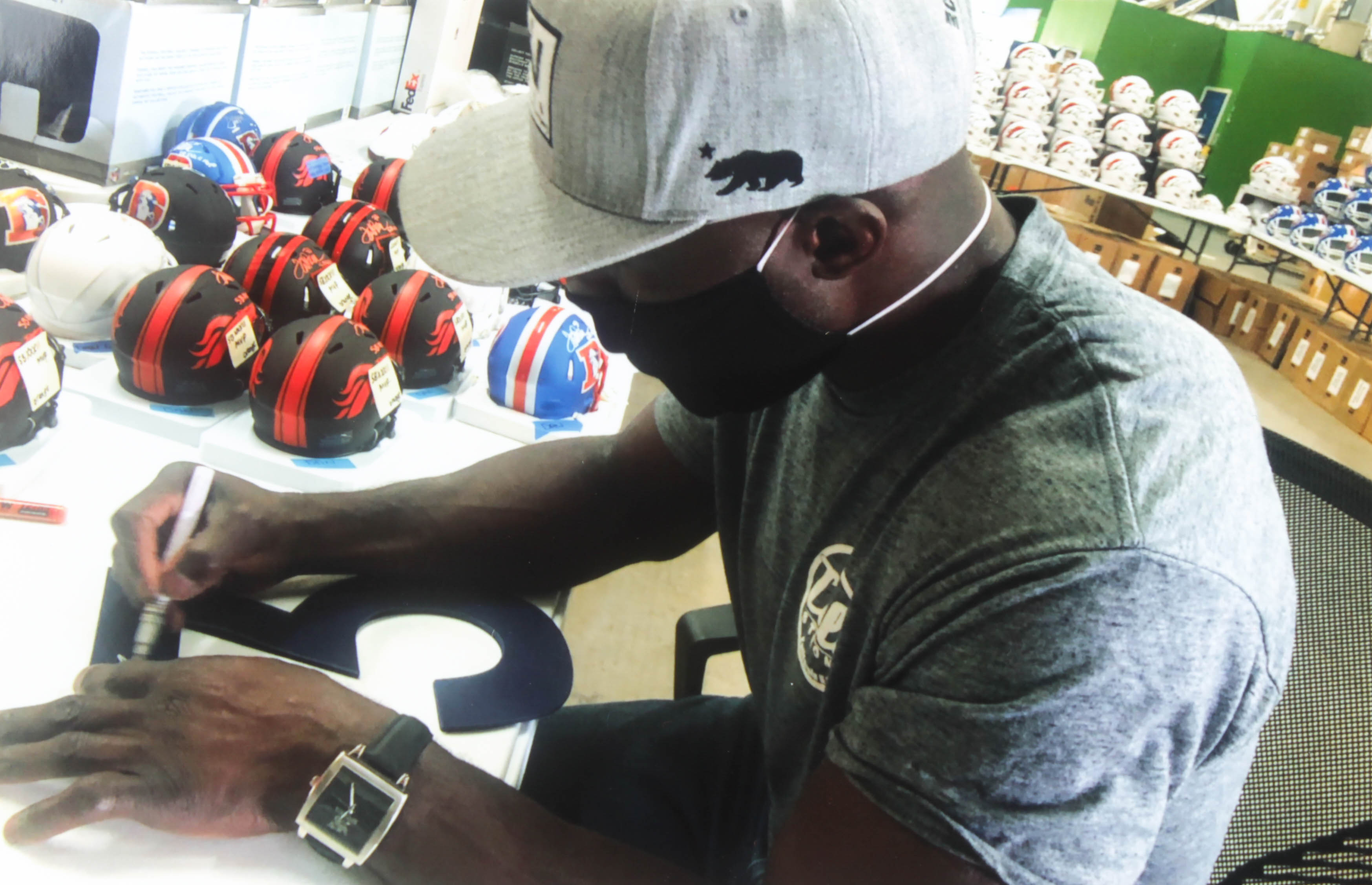 Custom on-field style jersey. Everything sewn on, size XL. Hand-signed by Terrell Davis (HOF).
