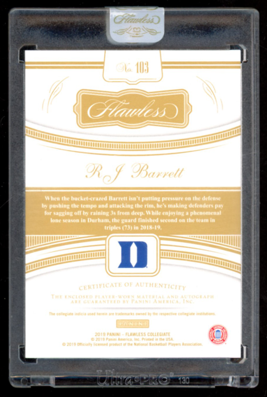 RJ Barrett 2019-20 Panini Flawless Collegiate Rookie Patch Autographs #103