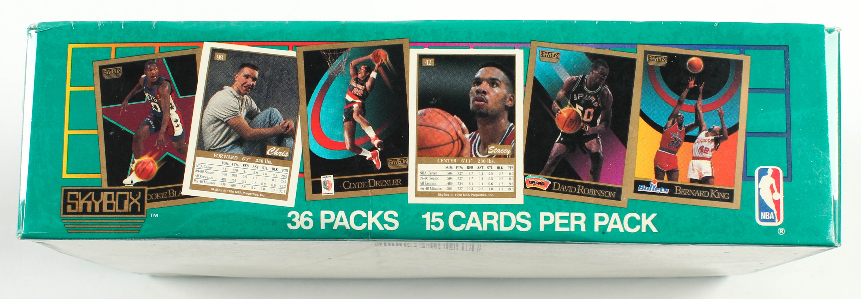 This 1990-91 set marks SkyBox's entry into the basketball card market. The complete set contains 423 standard-size cards featuring NBA players. The set was released in two series of 300 and 123 cards, respectively. Foil packs for each series contained 15 cards. However, the second series packs contained a mix of players from both series. The second series cards replaced 123 cards from the first series, which then became short-prints compared to other cards in the first series. The front features an action shot of the player on a computer-generated background of various color schemes. The player's name appears in a black stripe at the bottom with the team logo superimposed at the left lower corner. The photo is bordered in gold. The back presents head shots of the player with gold borders on white background. Player statistics are given in a box below the photo. The cards are checklisted below alphabetically according to team. Subsets are Coaches (301-327), Team Checklists (328-354), Lottery Picks (355-365), Updates (366-420), and Checklists (421-423). Rookie Cards of note included in the set are Derrick Coleman, Gary Payton, and Many More!!!