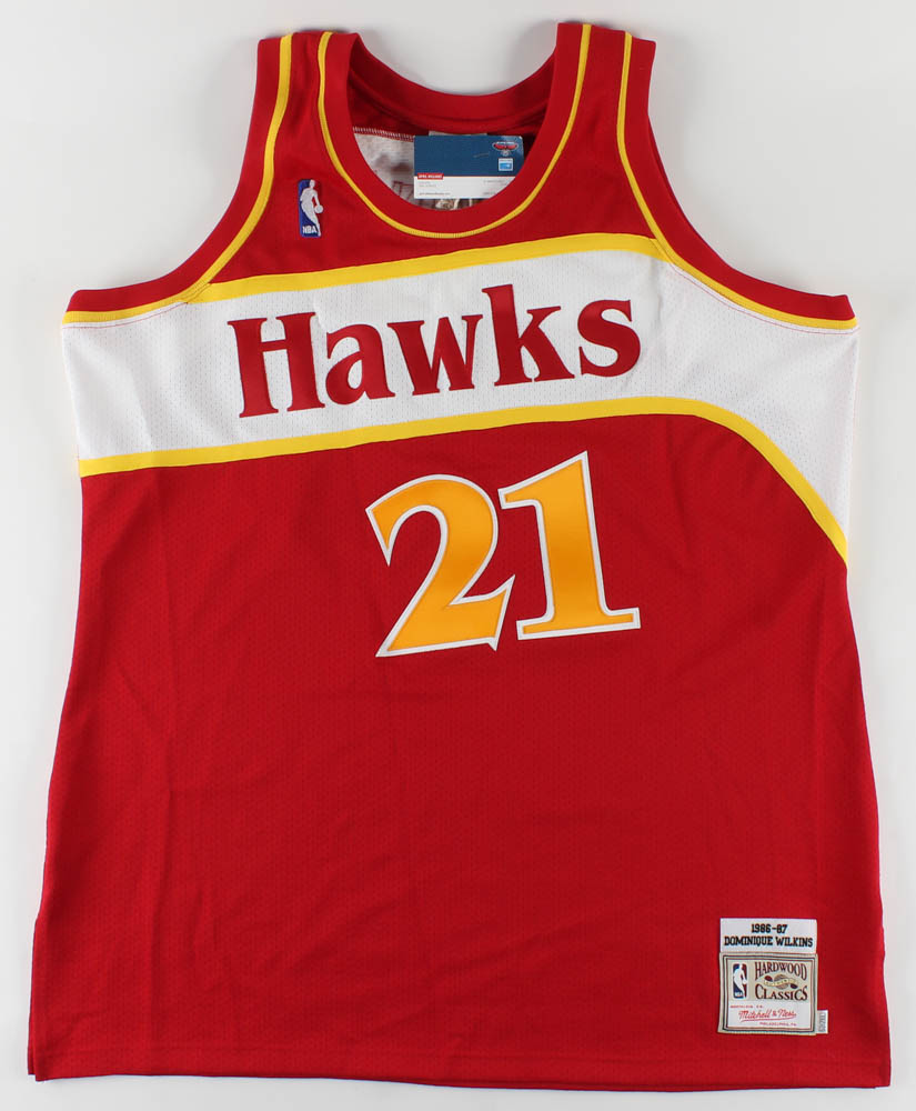 Mitchell & Ness on-court style jersey. Everything sewn on, size 52. Hand-signed by Dominique Wilkins (Atlanta Hawks, HOF).