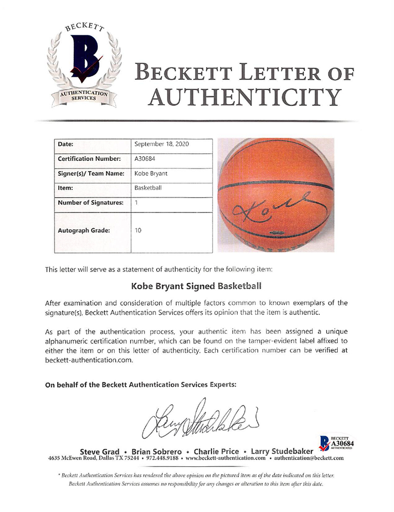 Kobe Bryant Signed Official NBA Game Ball Basketball (Beckett LOA & UDA Hologram)