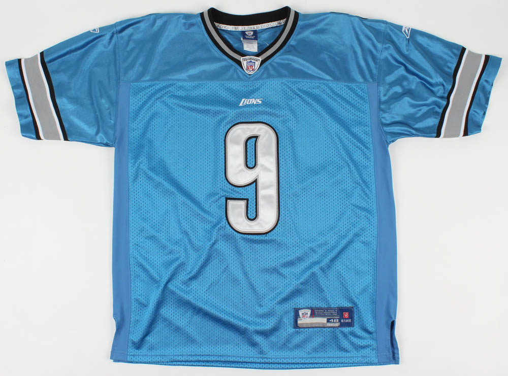 Reebok on-field style jersey. Everything is sewn on, size XL. Hand-signed by Matthew Stafford (Detroit Lions).