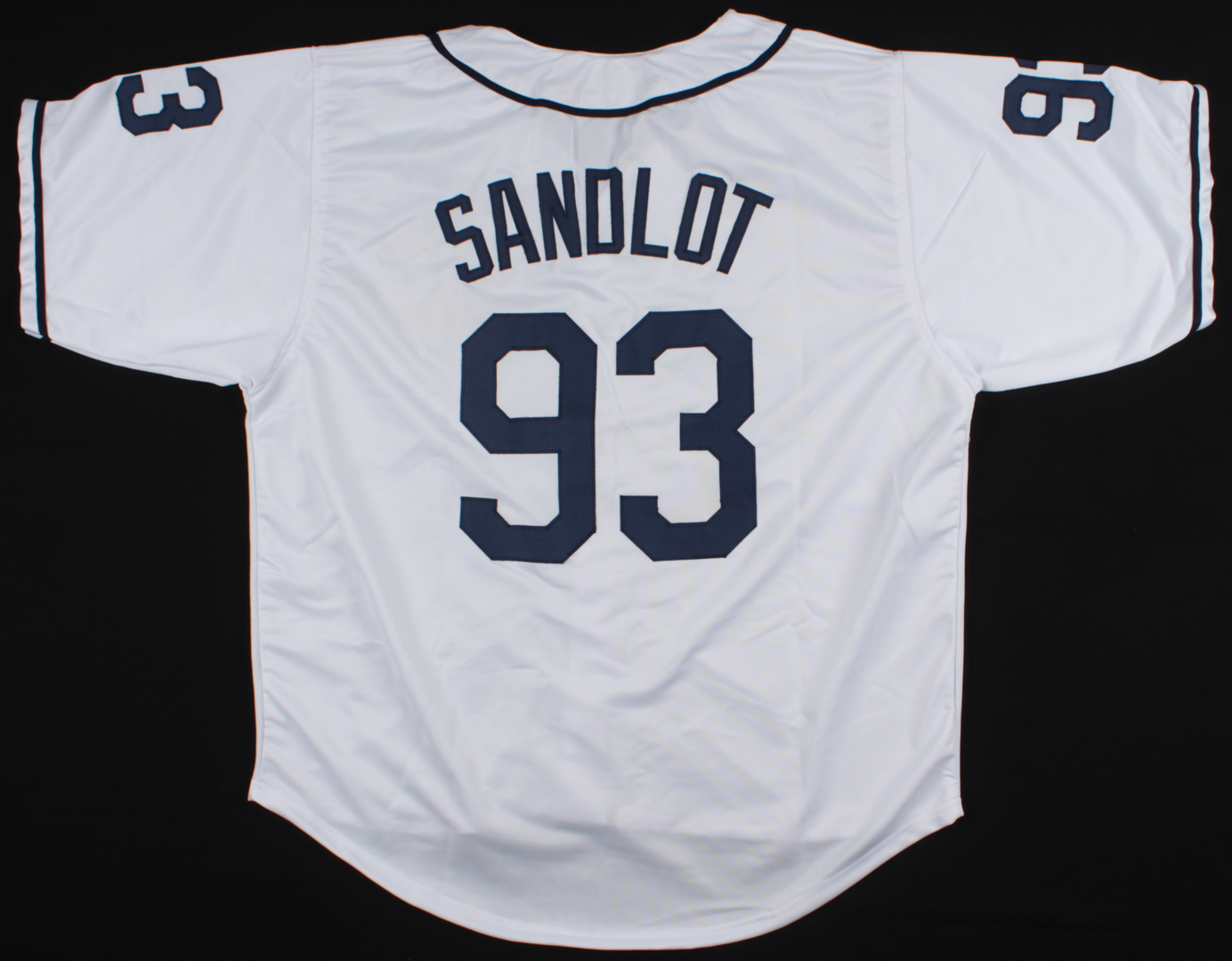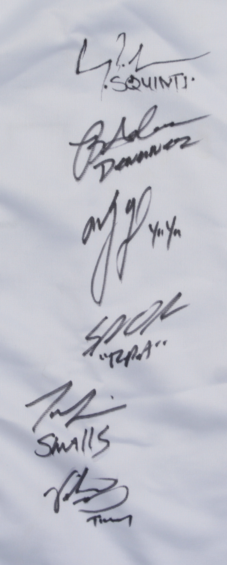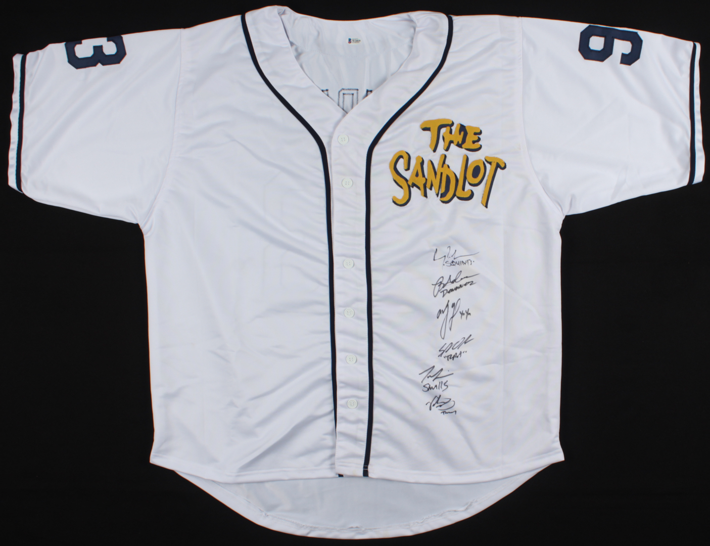 Custom on-field style jersey. Everything is sewn on, size XL. Has been hand-signed and inscribed in black felt-tip pen by (6) including Tom Guiry (Scotty Smalls), Chauncey Leopardi (Michael 'Squints' Palledorous), Marty York (Alan "Yeah-Yeah" McClennan), Shane Obedzinski (Tommy 'Repeat' Timmons), Victor DiMattia (Timmy Timmons), and Brandon Adams (Kenny DeNunez).