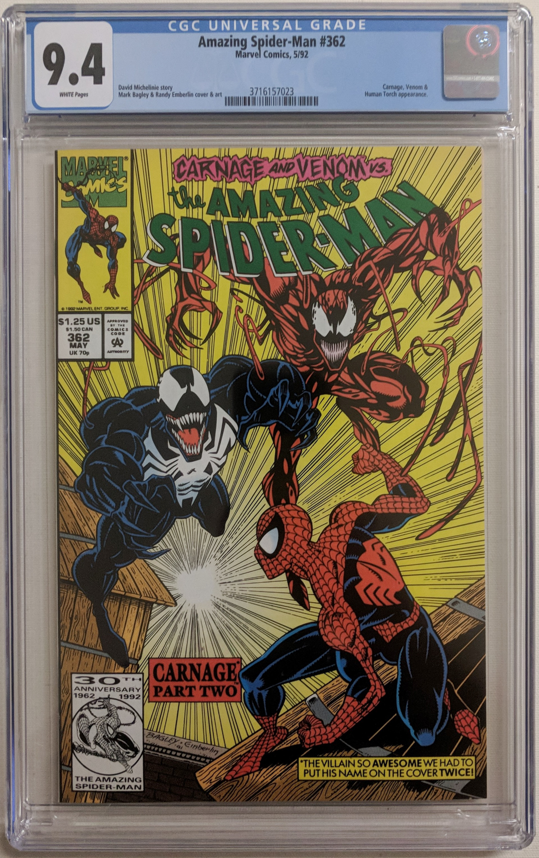 1992 "Amazing Spider-Man" Issue #362 Marvel comic book. The comic book has been given a grade of (CGC) 9.4.