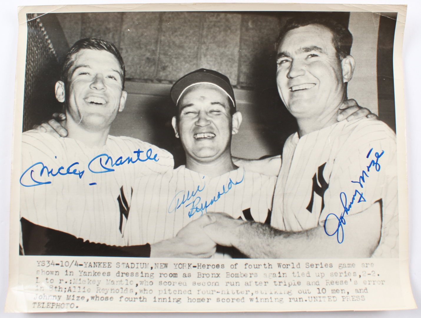 Original Wire Photo measures 11" x 14" in size and has been hand-signed by (3) former New York Yankees players, including Mickey Mantle (D. 1995, HOF), Allie Reynolds (D. 1994) and Johnny Mize (D. 1993, HOF).