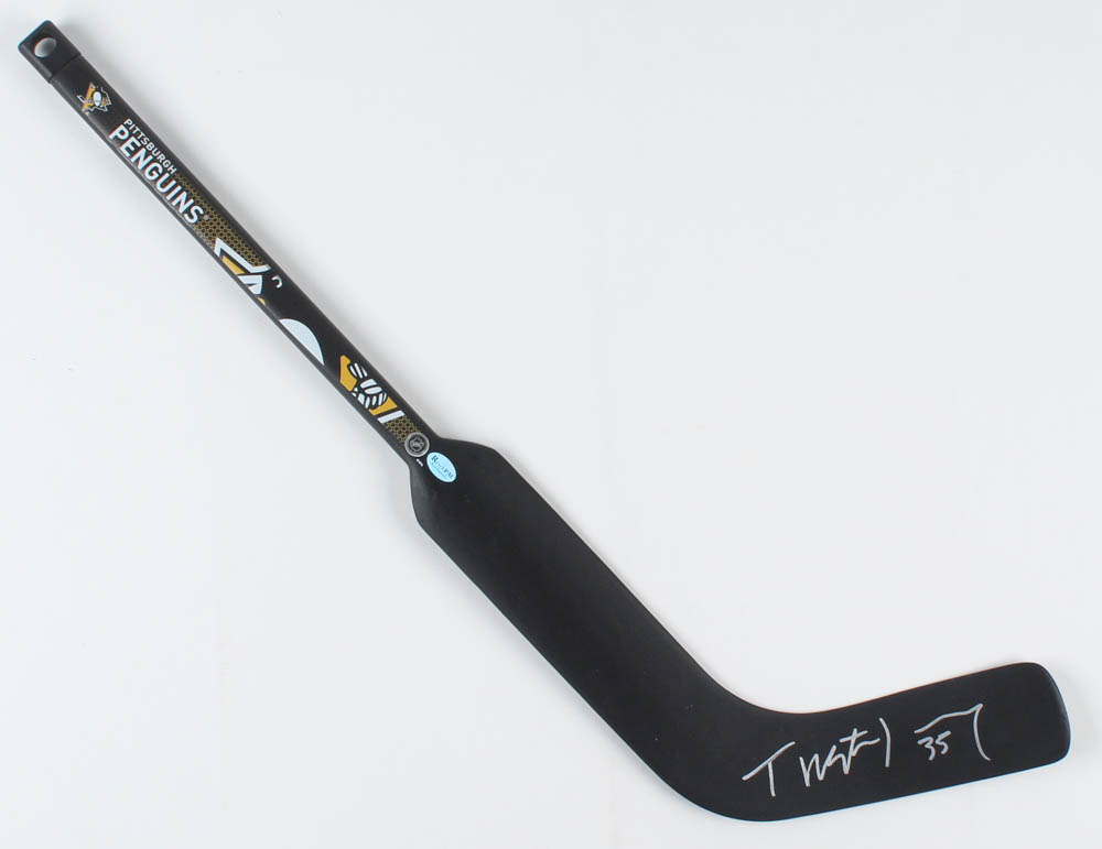Pittsburgh Penguins logo mini hockey stick. Hand-signed by Tristan Jarry.