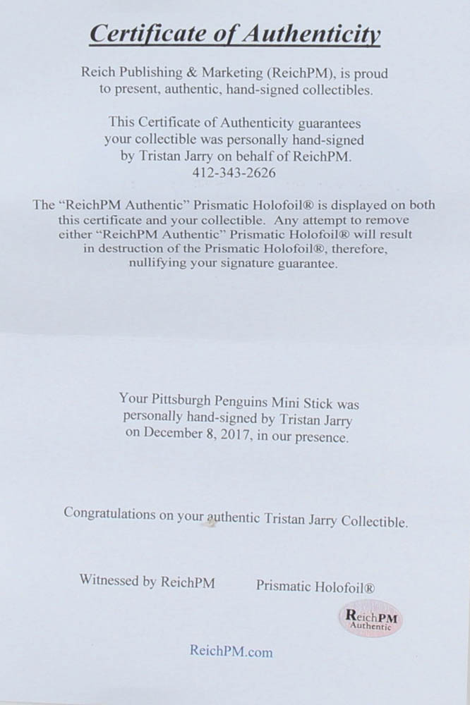 Tristan Jarry Signed Penguins Logo Mini Hockey Stick (ReichPM COA)