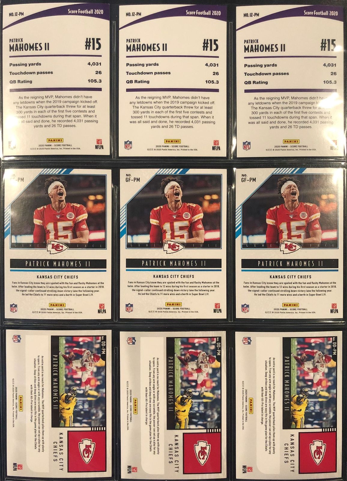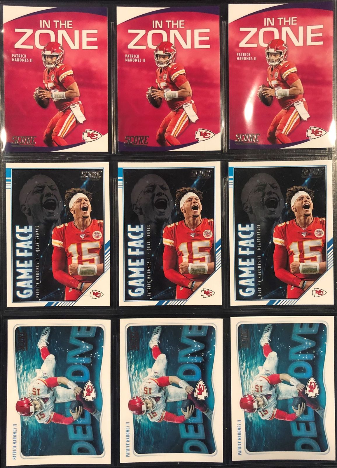 Lot of (9) Patrick Mahomes 2020 Score Insert Cards with (3) #IZPM In The Zone, (3) #GPPM Game Face, & (3) #DDPM Deep Dive