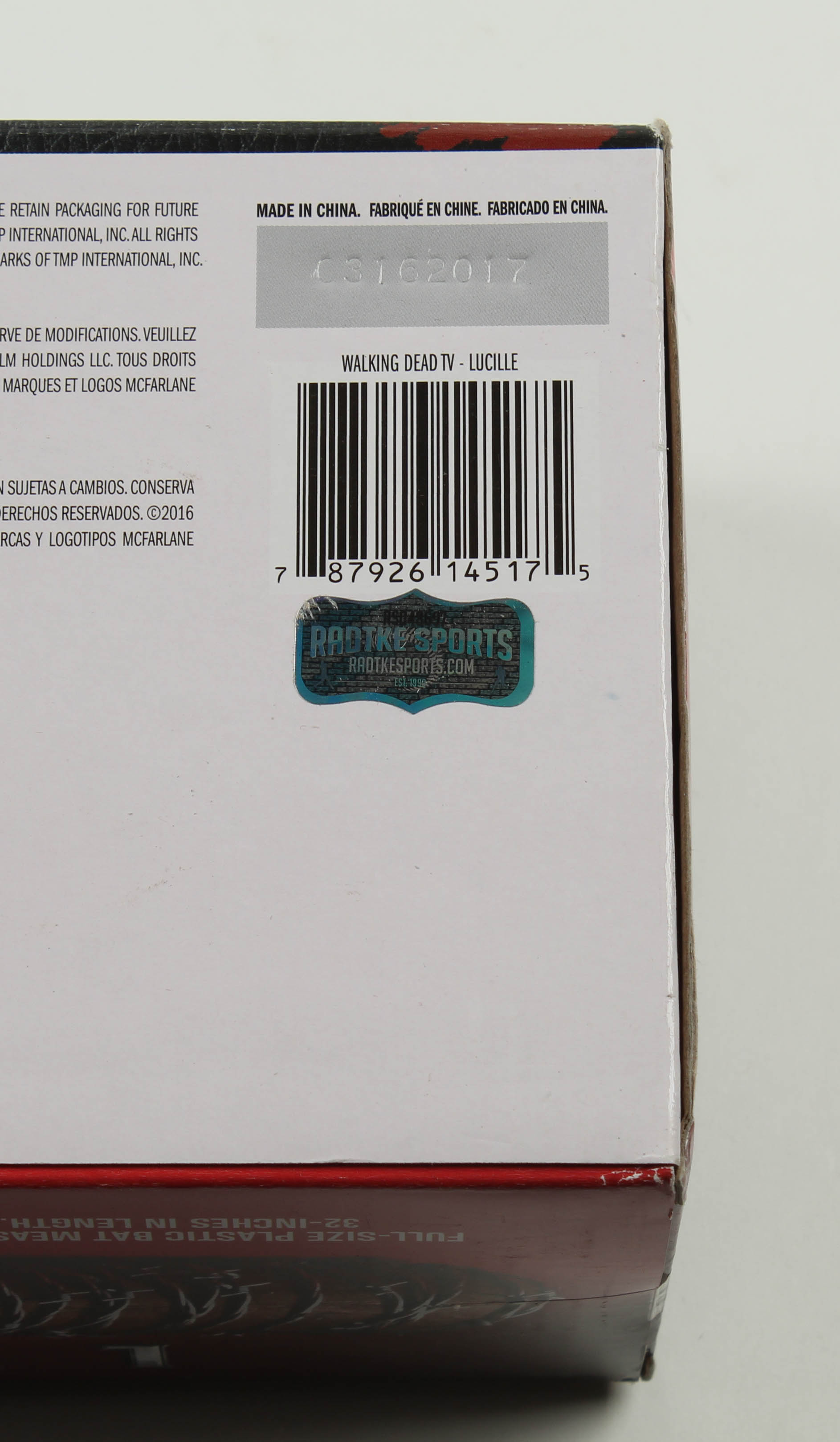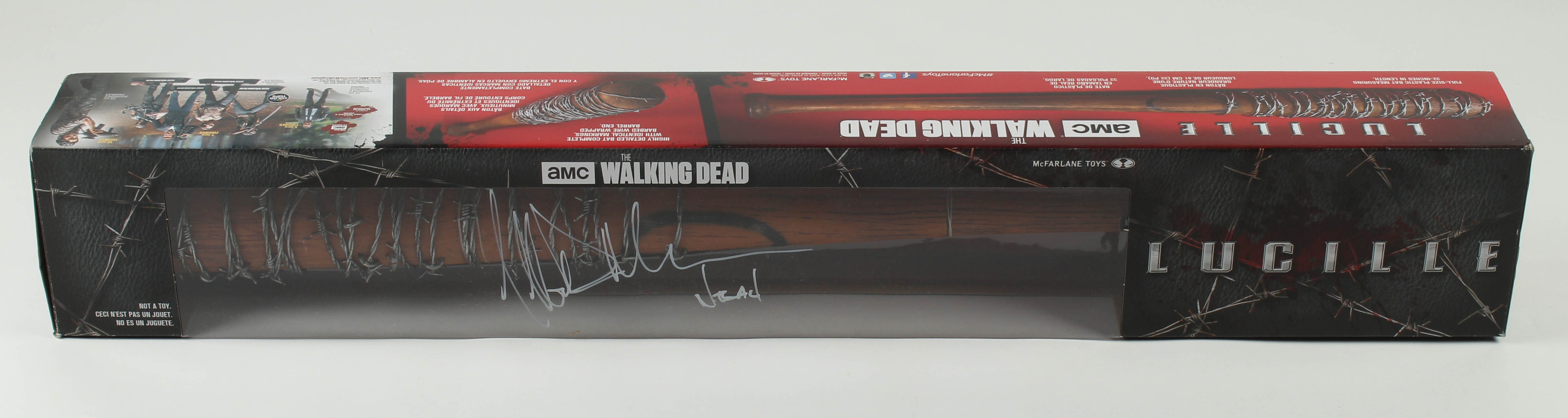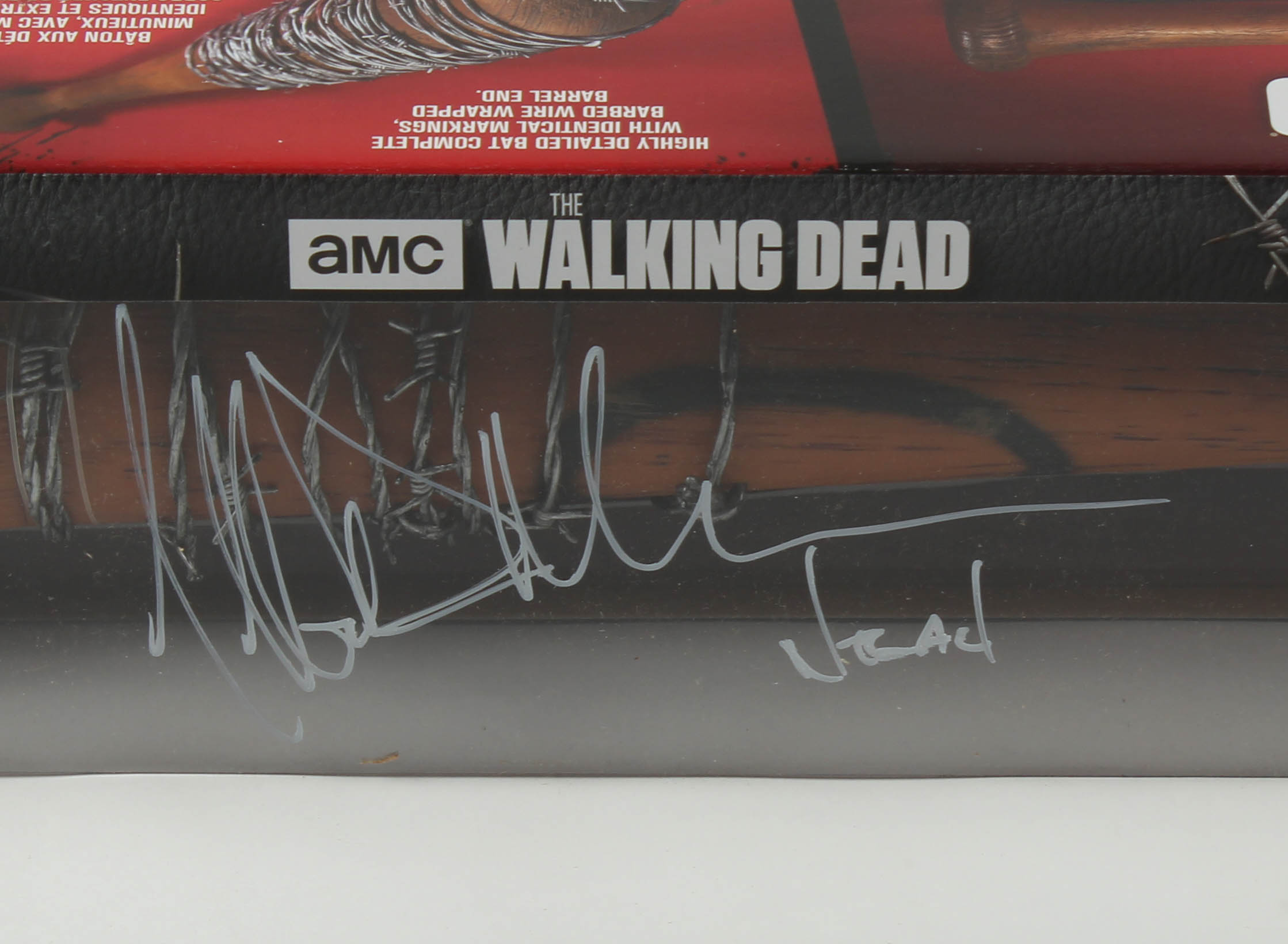 McFarlane Toys barbed wire baseball bat replica prop measures 32" in length and has been hand-signed and inscribed on the packaging by Jeffrey Dean Morgan.