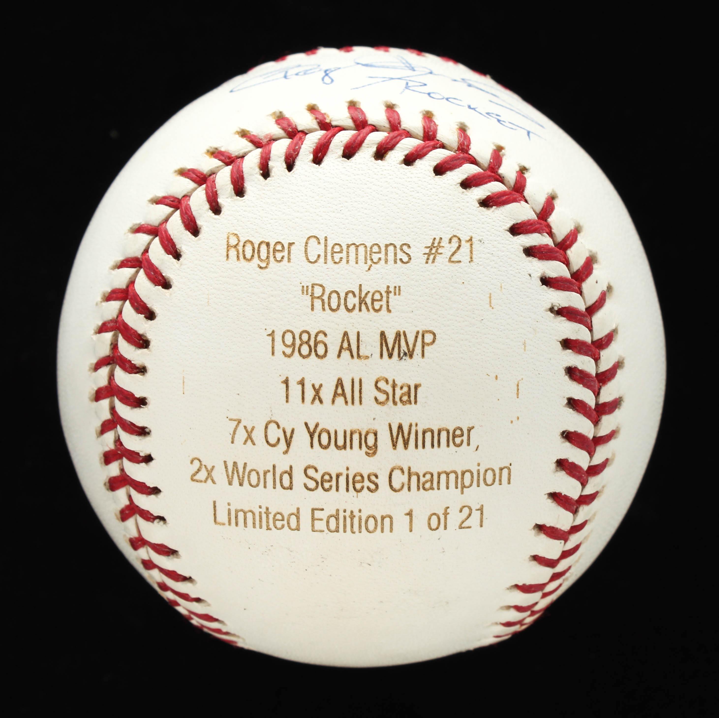 Rawlings Official Major League baseball. Hand-signed by Roger Clemens (New York Yankees). Clemens's career stat highlights have been custom engraved into the baseball. Limited Edition #1/21. Please see images for details regarding the condition of the baseball.