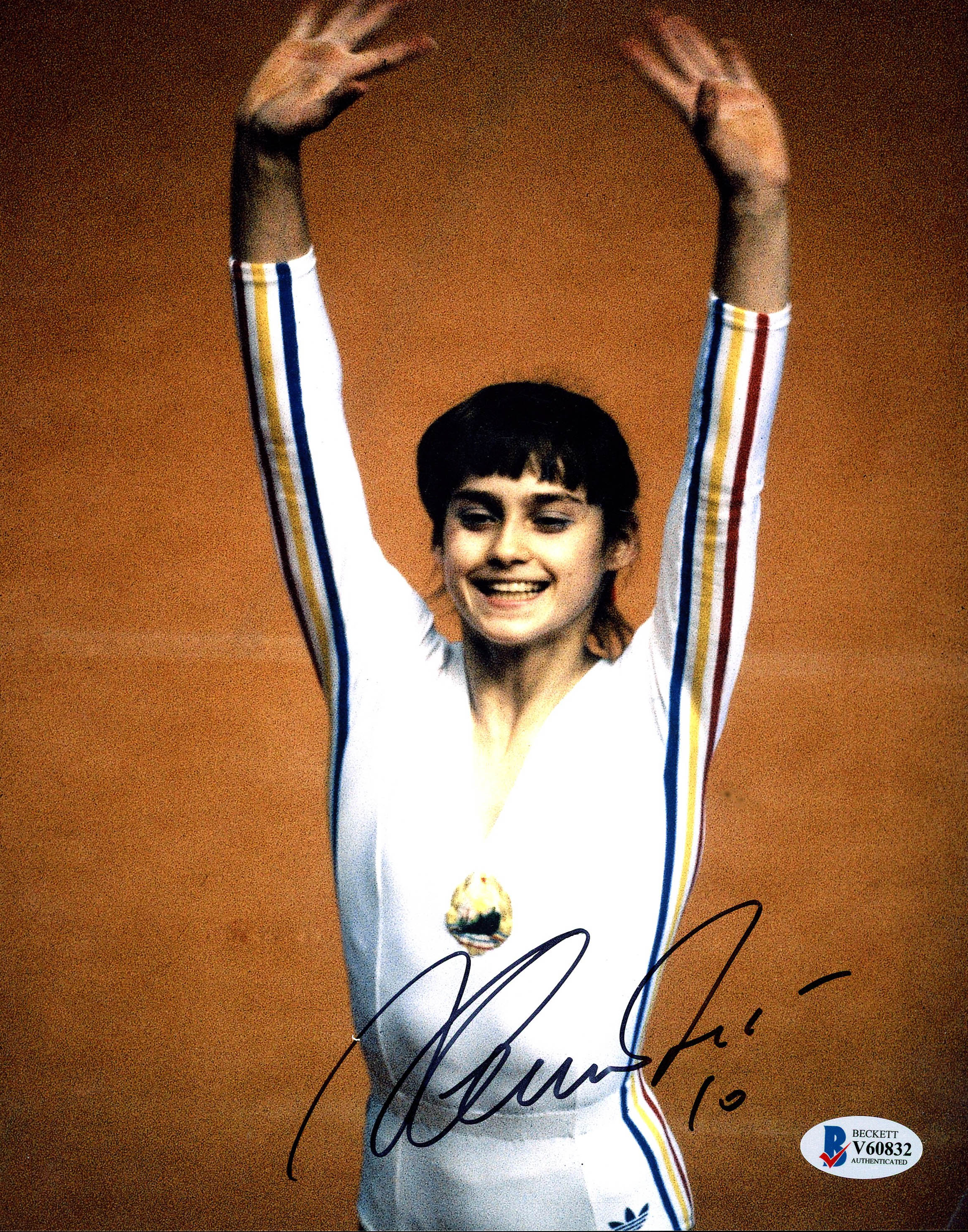 Photo measures 8" x 10" in size and has been hand-signed by Nadia Comaneci.
