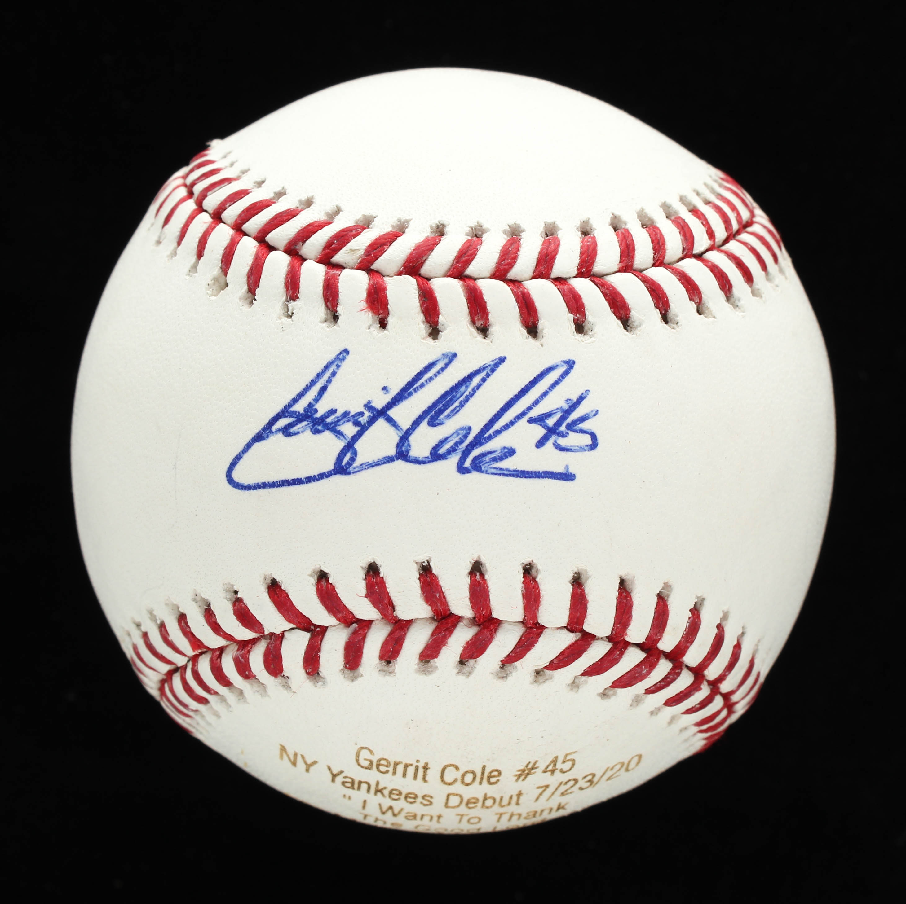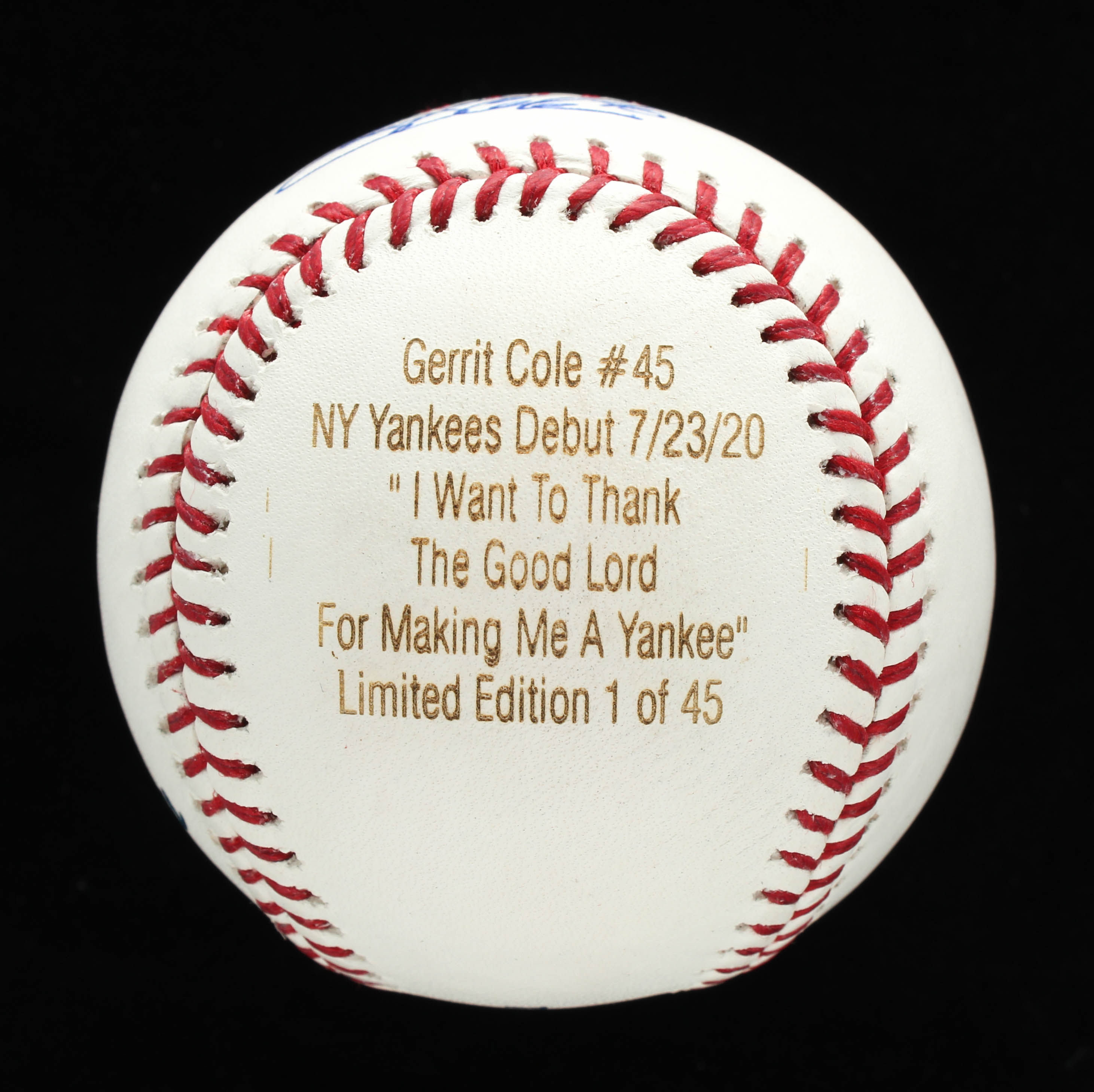 Rawlings Official Major League baseball. Hand-signed by Gerrit Cole (New York Yankees). Cole's career stat highlights have been custom engraved into the baseball. Limited Edition #1/45. Please see images for details regarding the condition of the baseball.