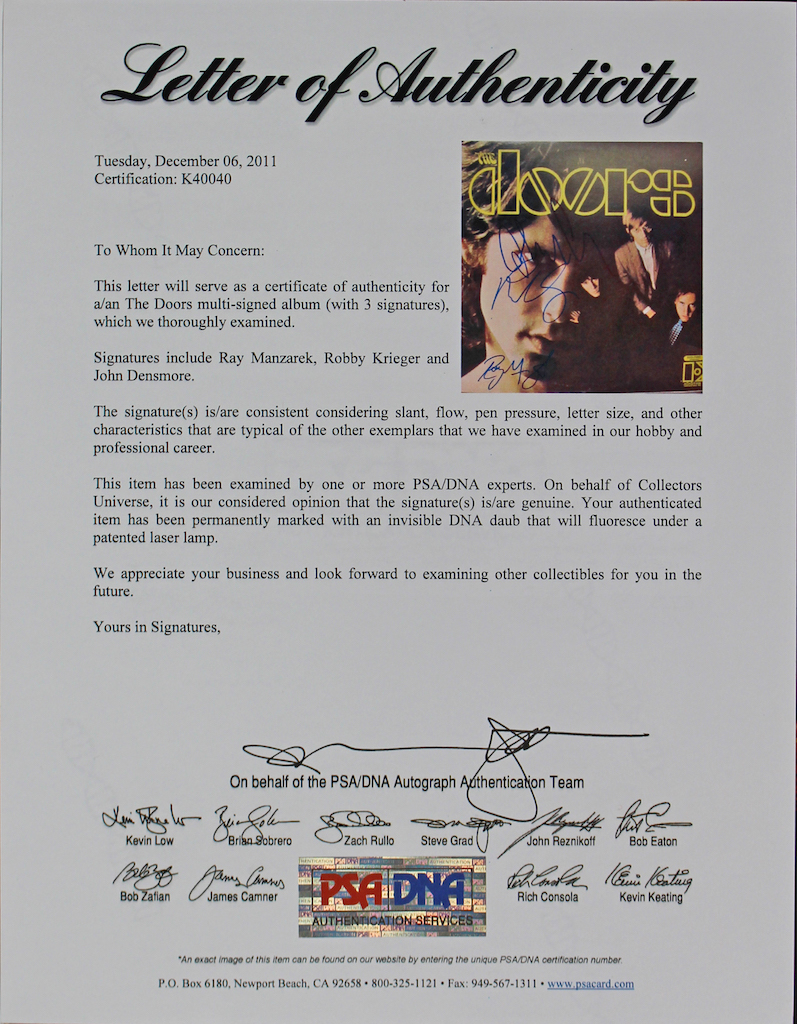 Vinyl record cover has been hand-signed by Ray Manzarek (D. 2013), Robby Krieger and John Densmore. Please note, the record is included in the sleeve.
