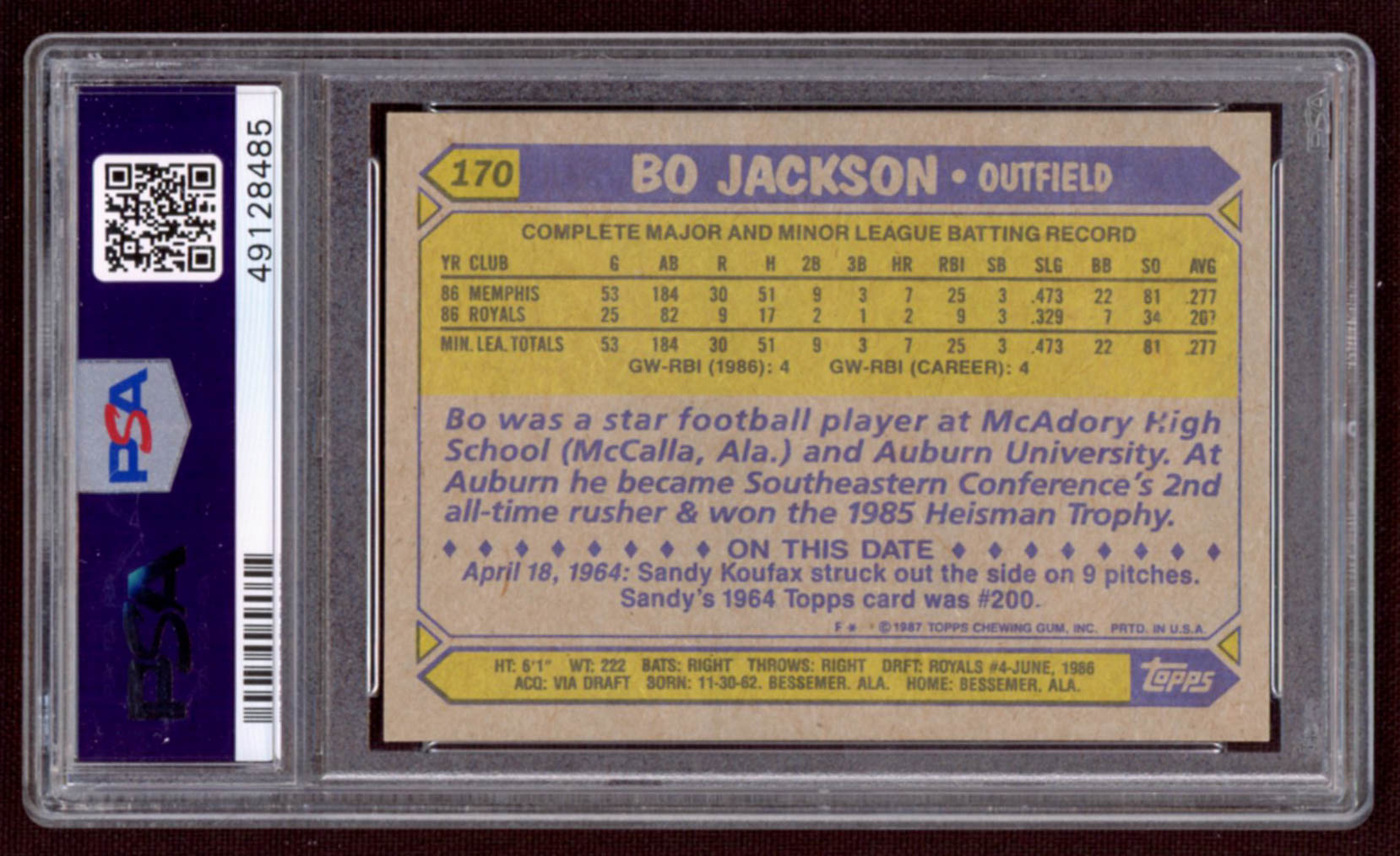 Bo Jackson 1987 Topps #170 RC (PSA 10)
