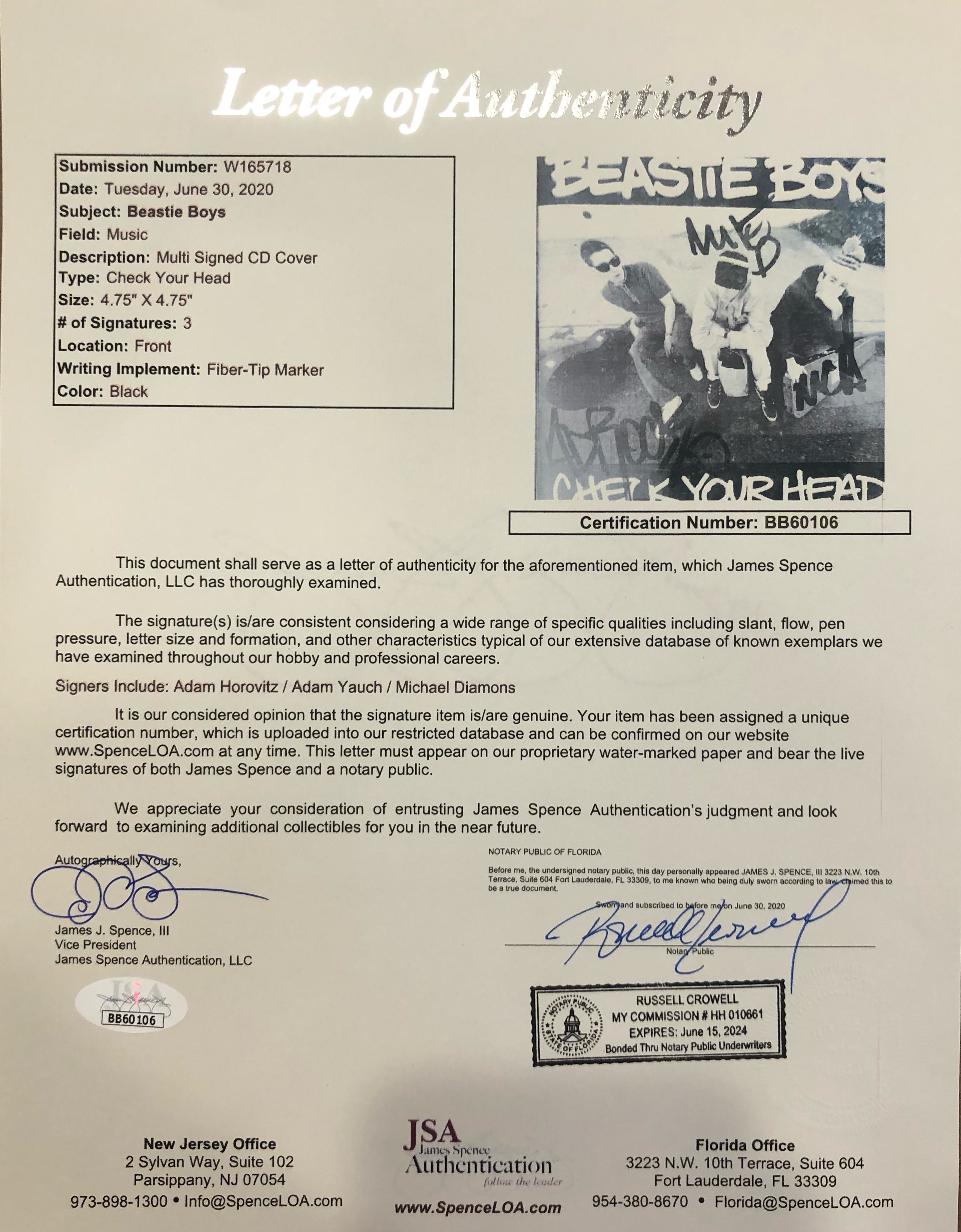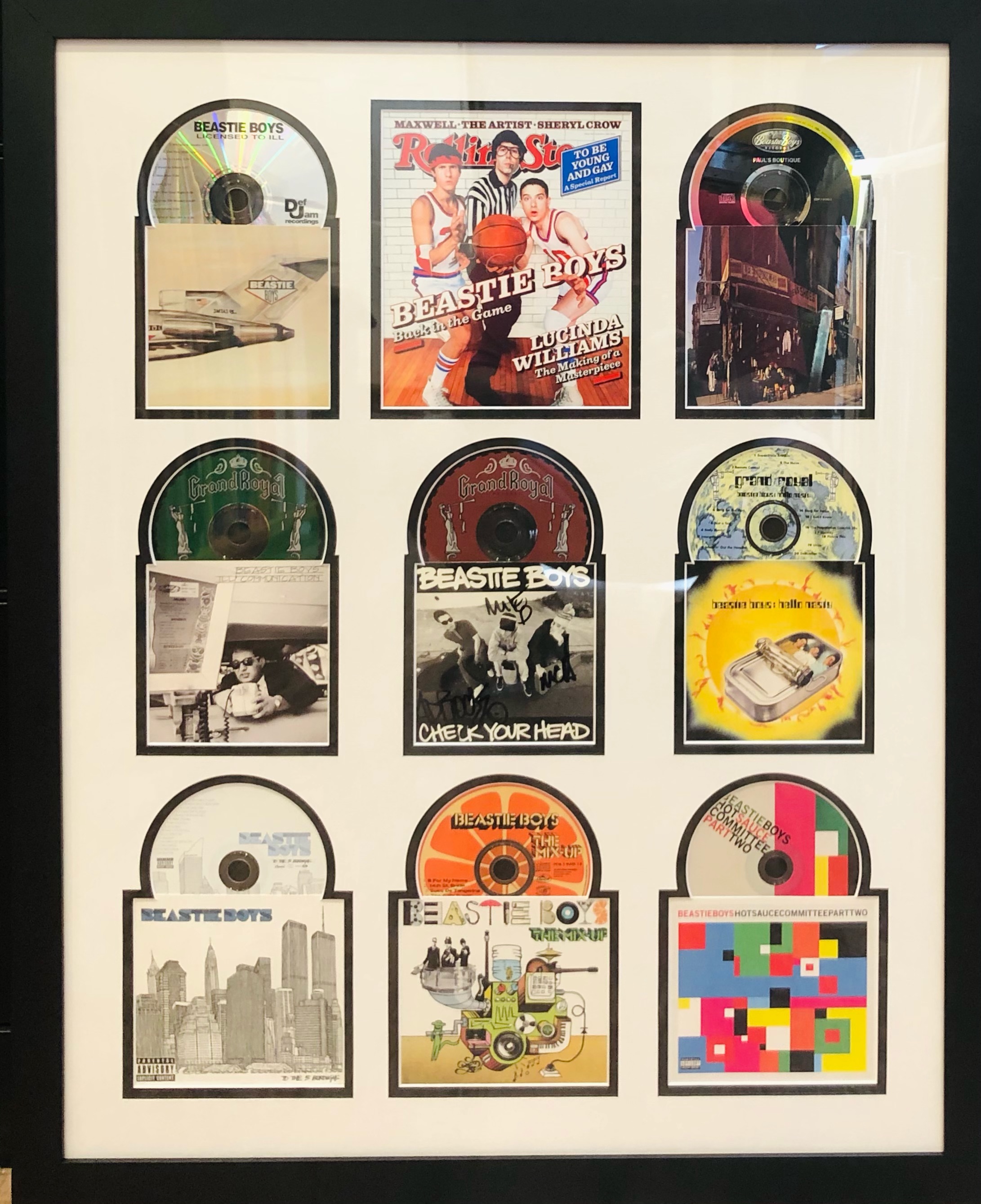 Custom framed display with acid-free mats and premium clear plexi-glass measures 25" x 31" in size. Featuring 8 of there top hits CDs, “Check your head” that has been hand-signed by all three members of the legendary American rap and rock band “The Beastie Boys” including Michael "Mike D" Diamond, Adam "Ad-Rock" Horovitz, and Adam "MCA" Yauch (D. 2012).