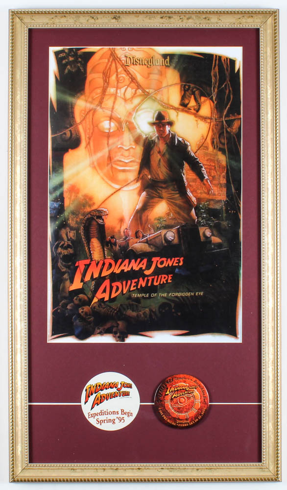 Custom framed display measures 15" x 26" in size and features a vintage Disneyland "Indiana Jones Adventure: Temple of the Forbidden Eye" print as well as a decal.