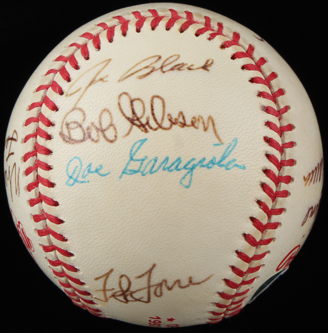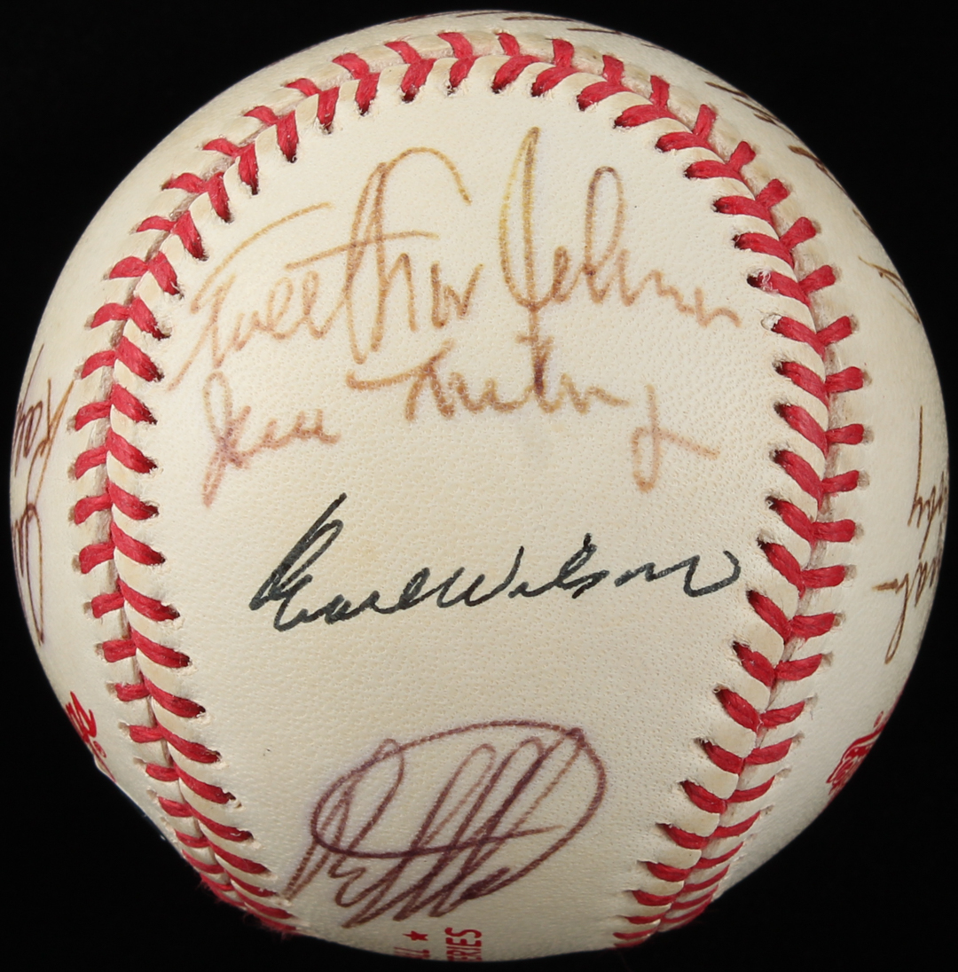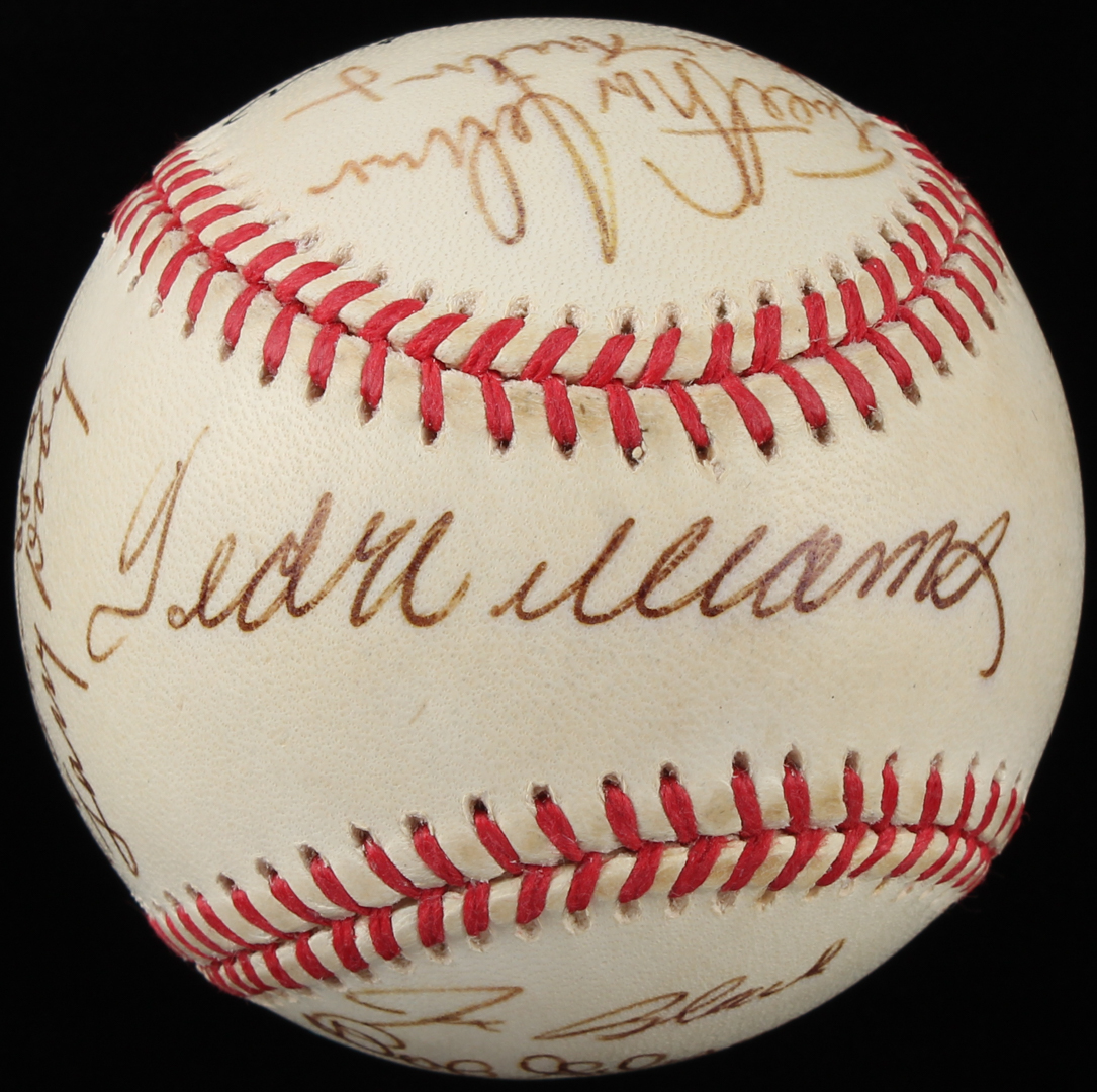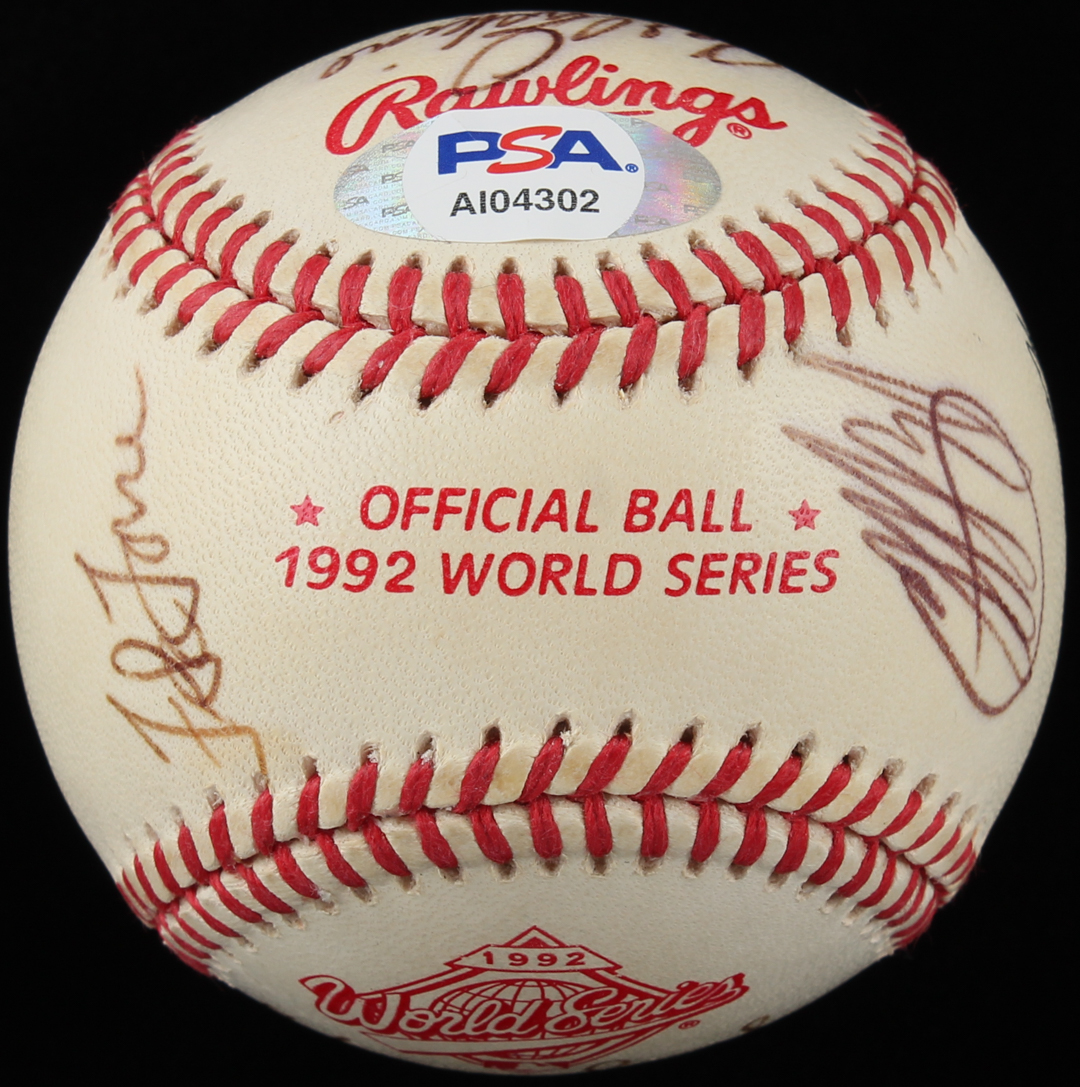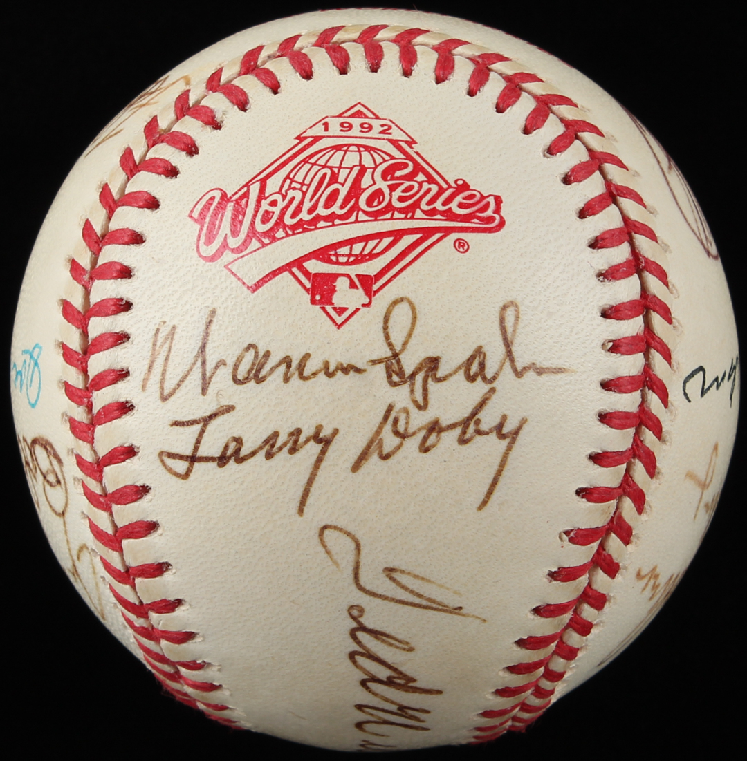 Rawlings Official 1992 World Series baseball. Hand-signed by Ted Williams, Lou Brock, Joe Black, Rusty Staub, Larry Doby, Warren Spahn, Joe Garagiola and (6) others.