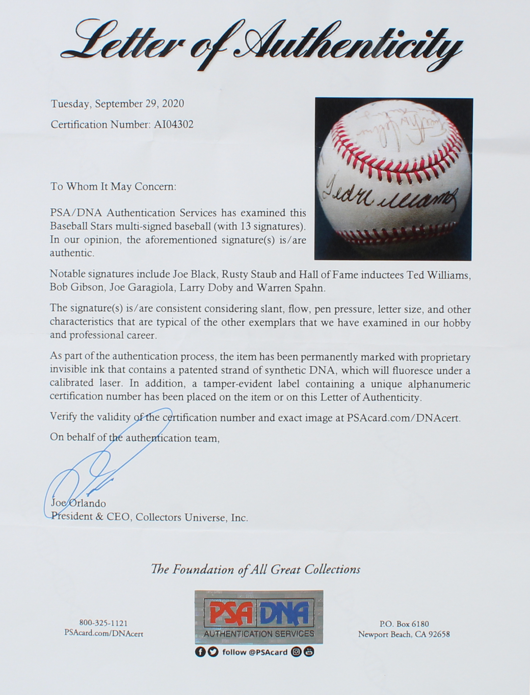 MLB Hall of Famers & Stars Official 1992 World Series Baseball Signed by (13) with Ted Williams, Lou Brock, Bob Gibson, Joe Garigiola, Joe Black, Rusty Staub, Larry Doby, Warren Spahn (PSA LOA)