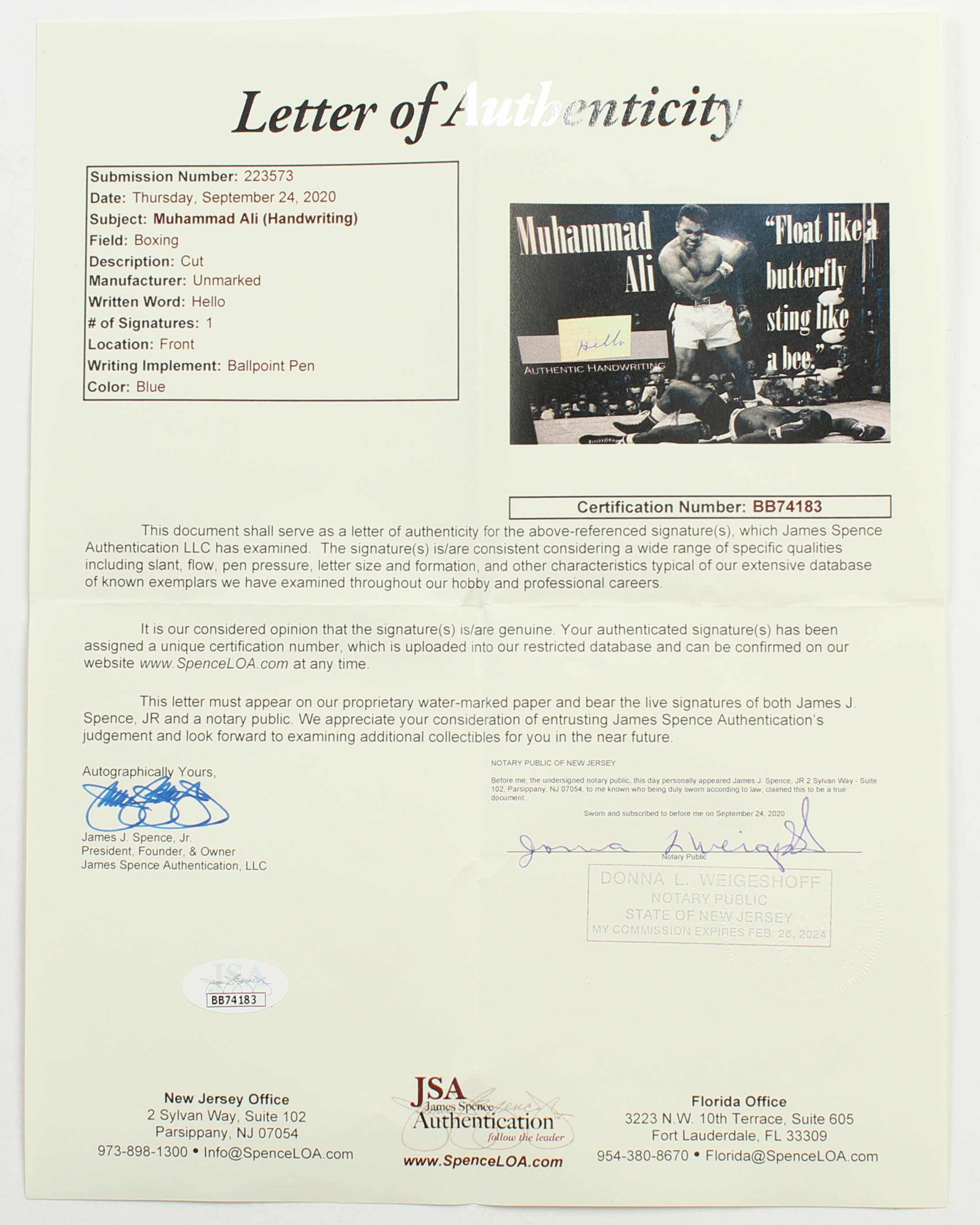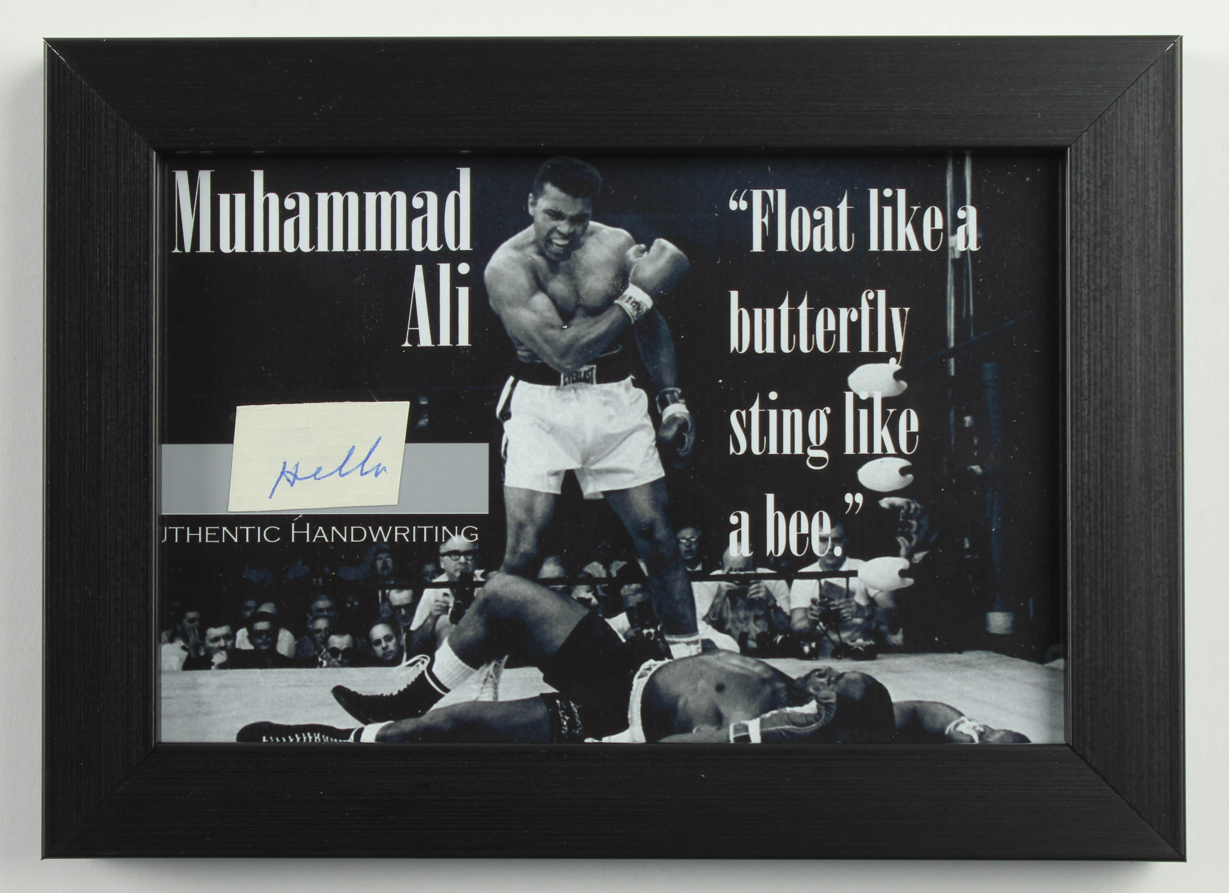 Custom framed display measures 5" x 7" in size and features a cut that was penned in the hand of Muhammad Ali (D. 2016, HOF).