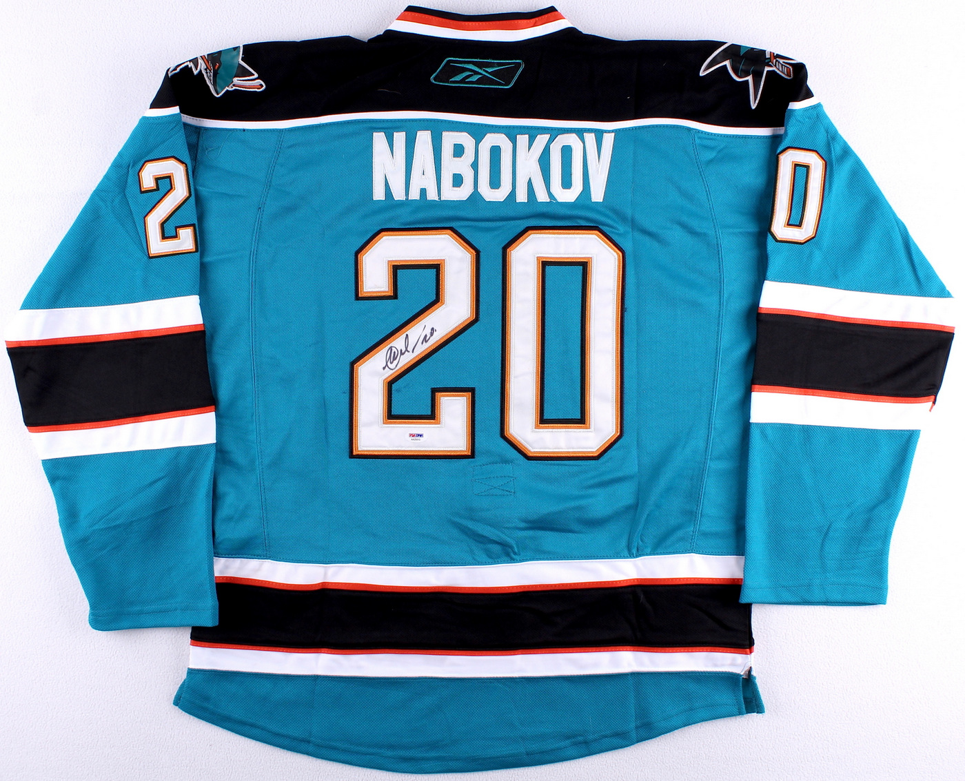 Reebok on-ice style jersey. Everything is sewn on, size 50. Hand-signed in black felt tip pen by Evgeni Nabokov. The autograph includes an official PSA/DNA hologram and matching COA for authenticity purposes.