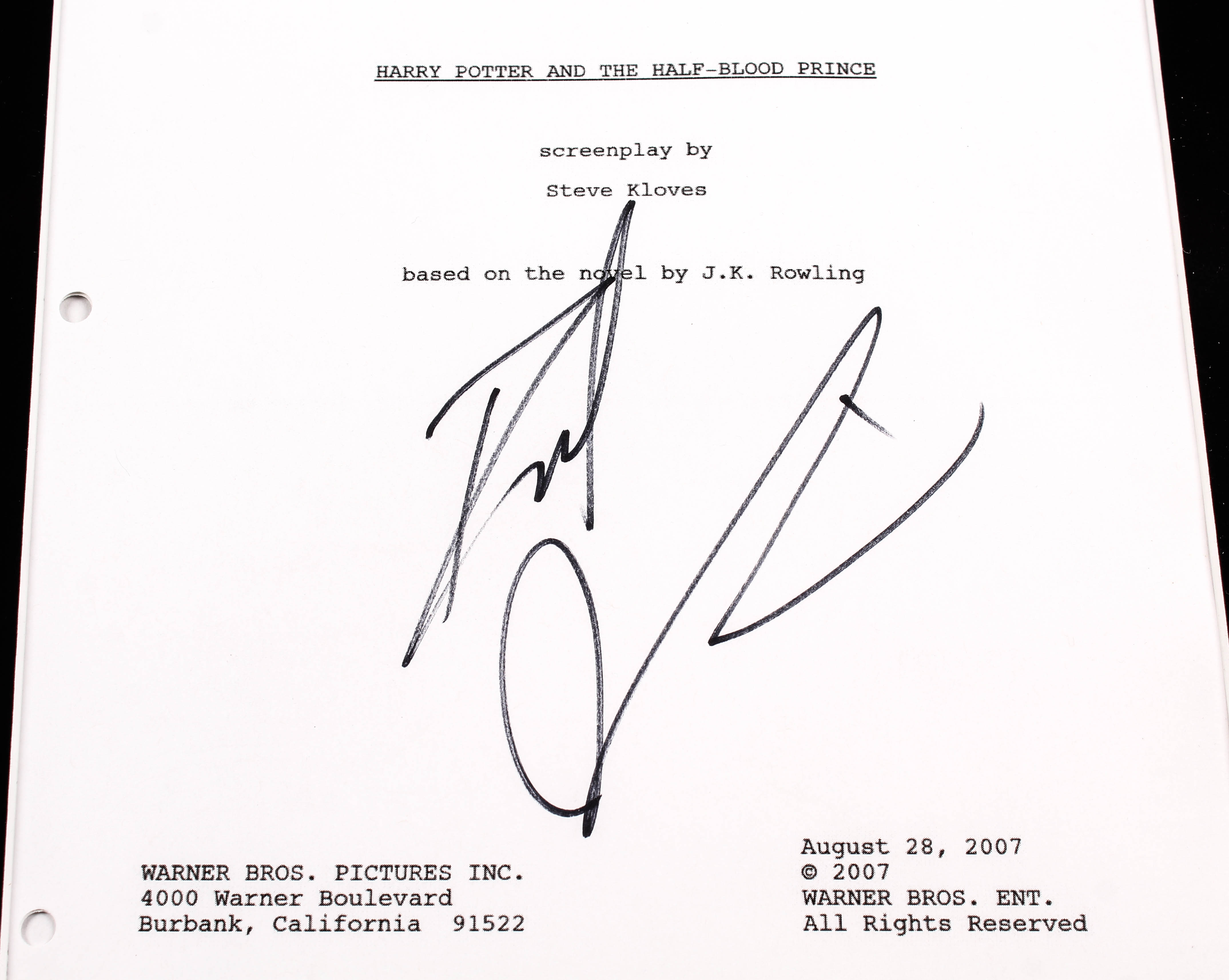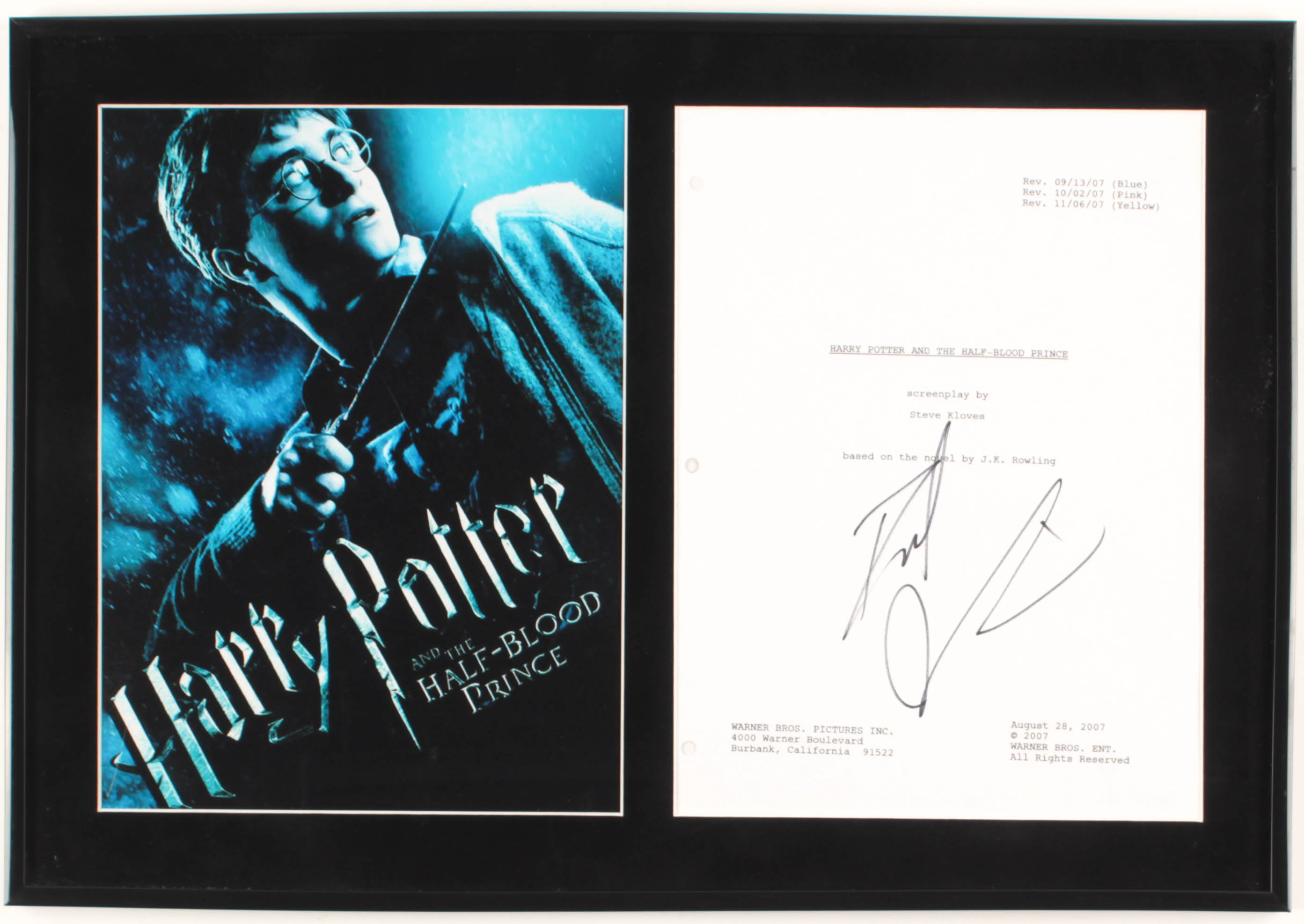 Custom frame measures approximately 13.5" x 19.5" in size and features a script cover from the film "Harry Potter and the Half-Blood Prince" that has been hand-signed by Daniel Radcliffe.