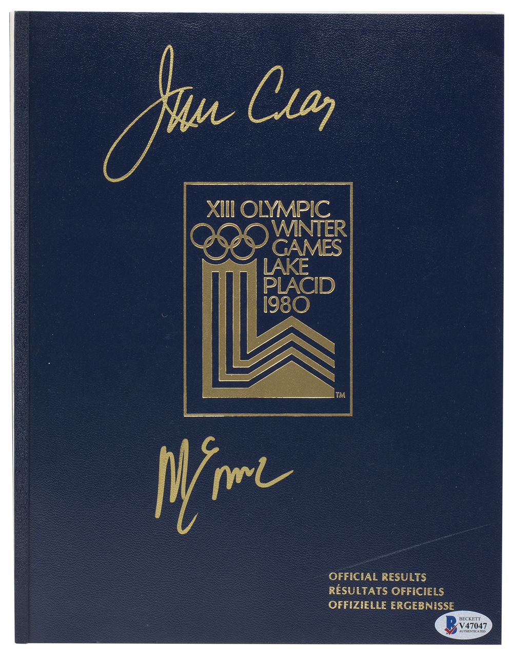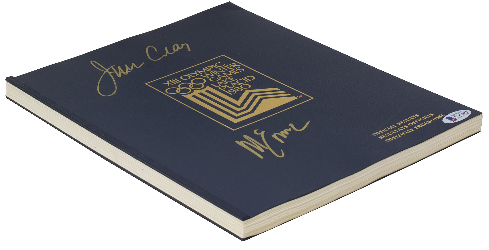 1980 Olympic Games Official Results Book has been hand-signed on the cover by Jim Craig (Team USA) and Mike Eruzione (Team USA)