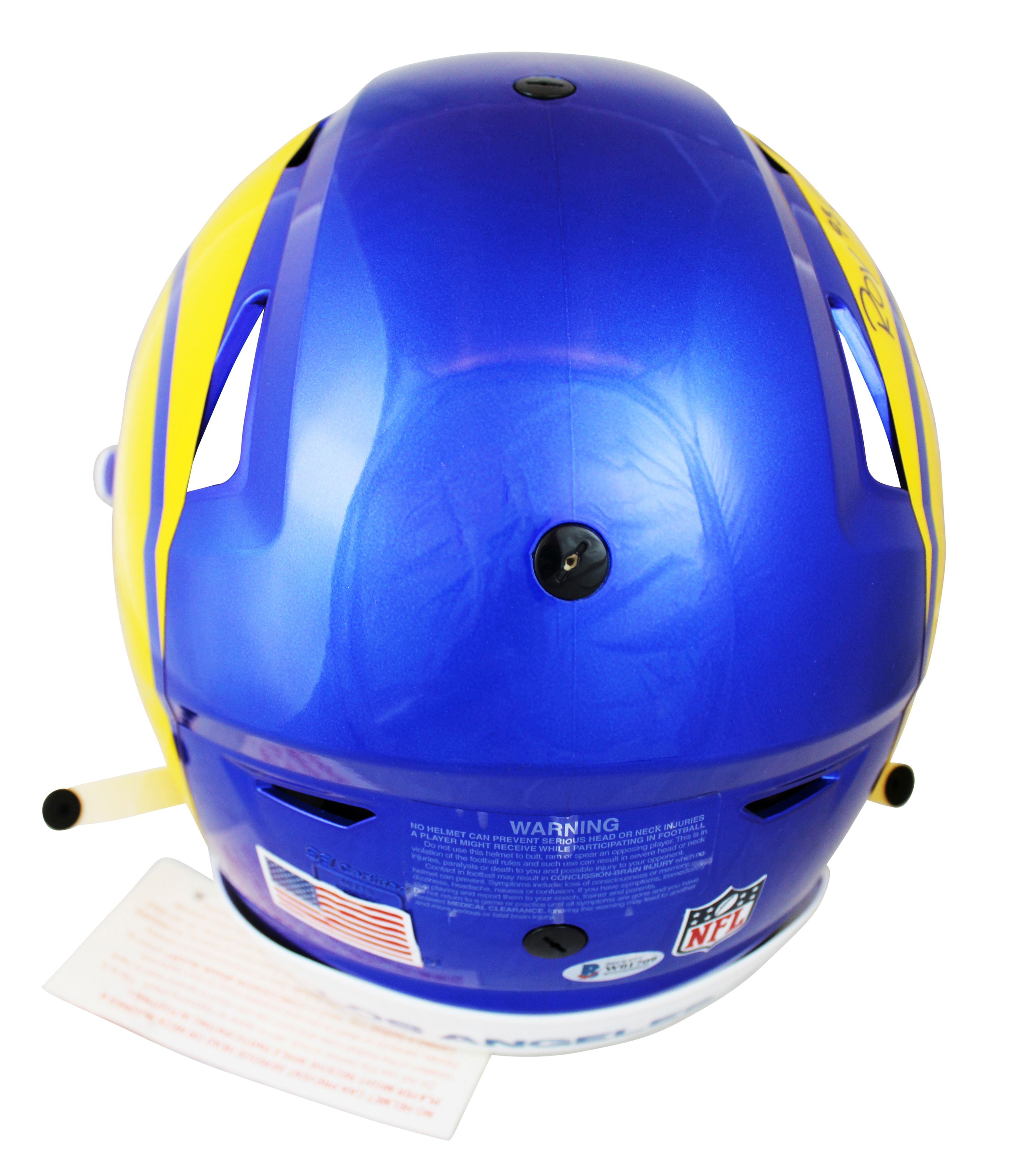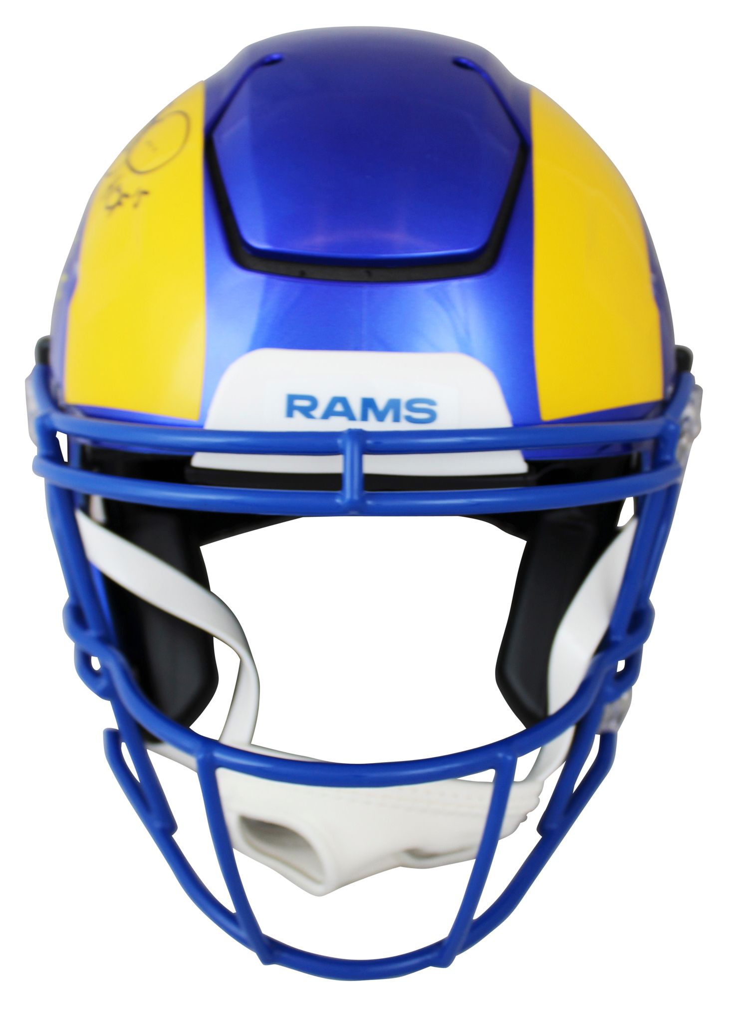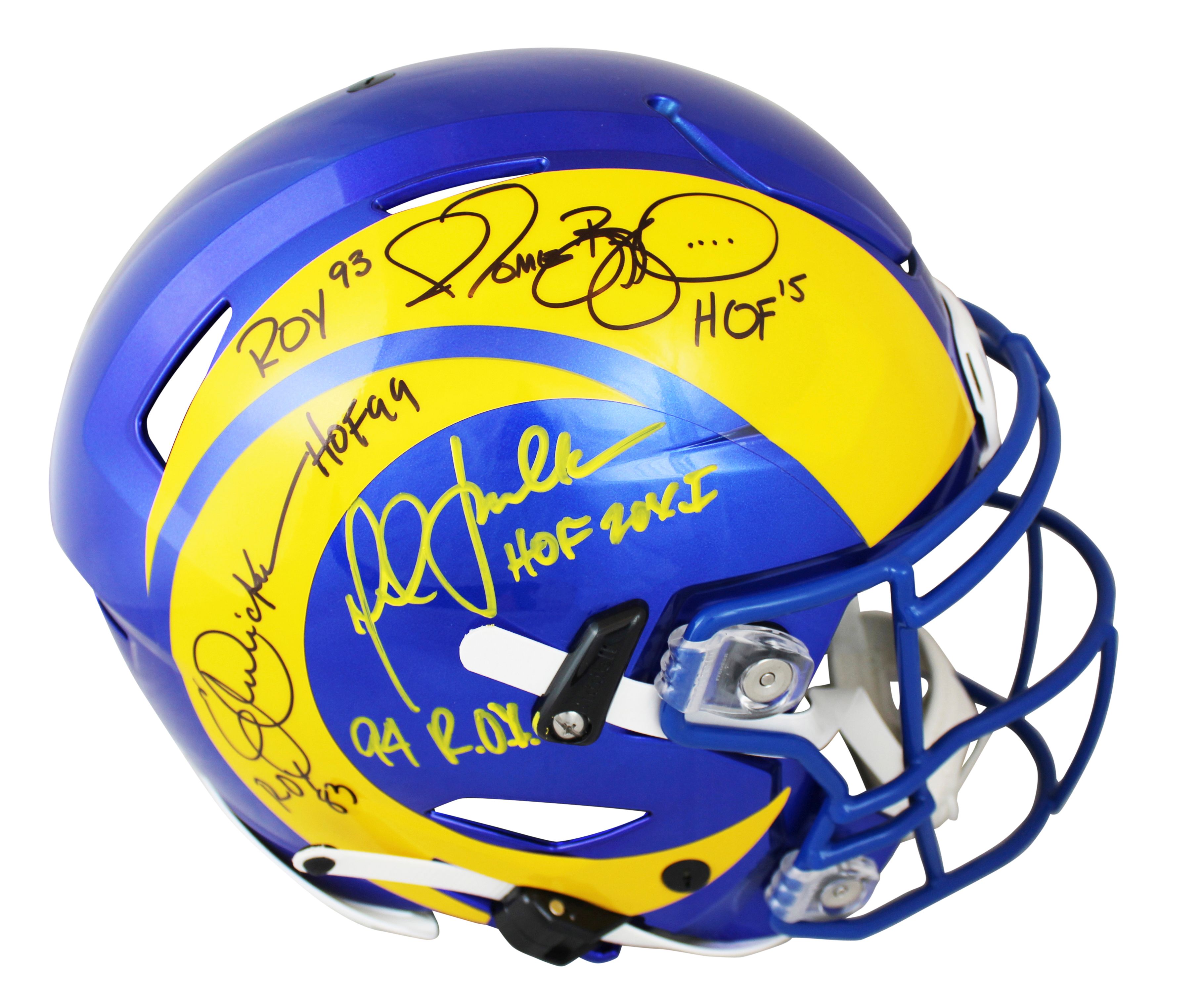 Riddell Los Angeles Rams full-size authentic on-field SpeedFlex helmet. Hand-signed and inscribed by Eric Dickerson (HOF), Marhsall Faulk (HOF), and Jerome Bettis (HOF).