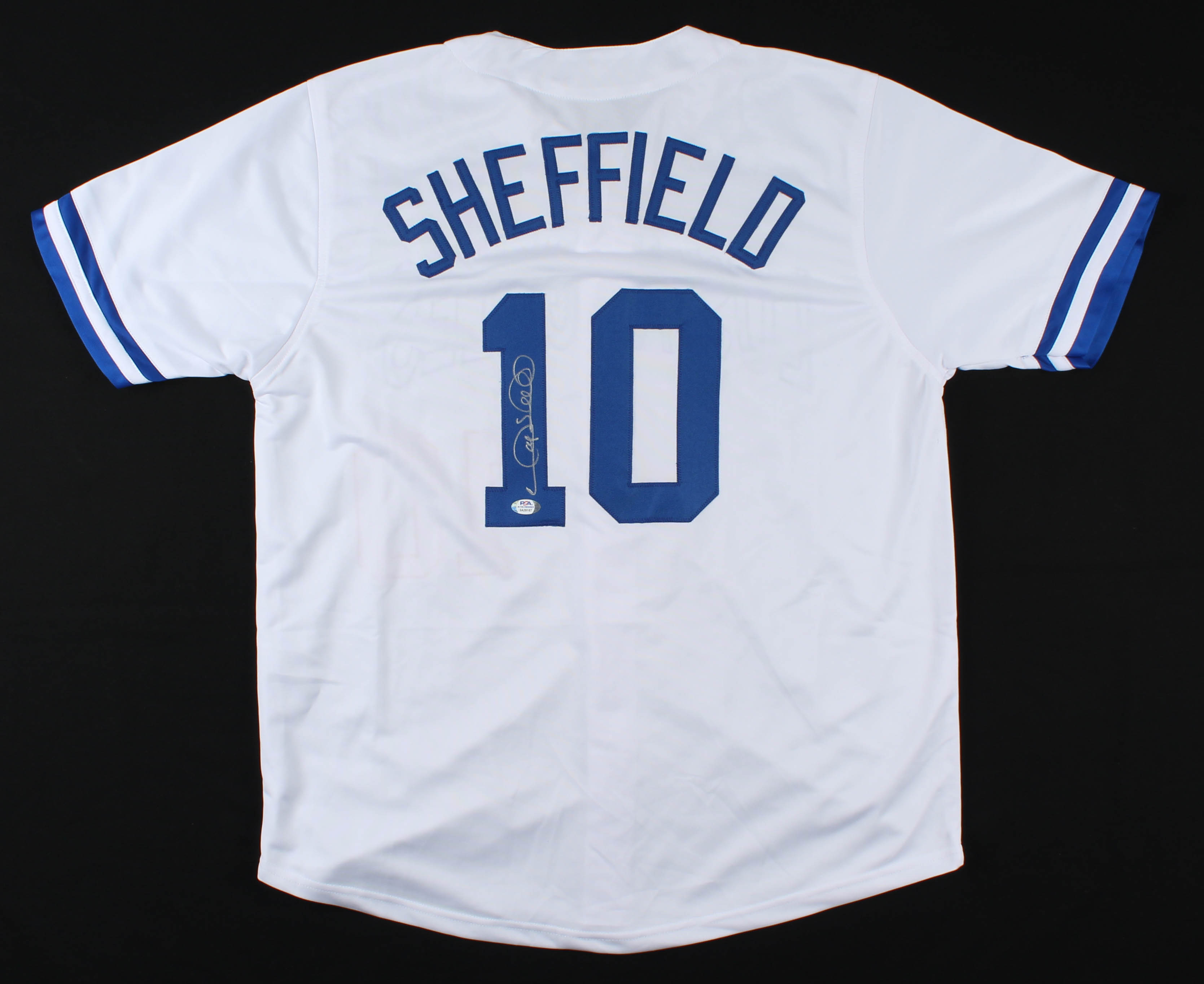 Custom on-field style jersey. Everything is sewn on, size XL. Has been hand-signed by Gary Sheffield.