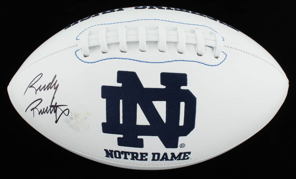 Notre Dame Fighting Irish logo football. Hand-signed by Rudy Ruettiger. Please see images regarding the condition of the ball.