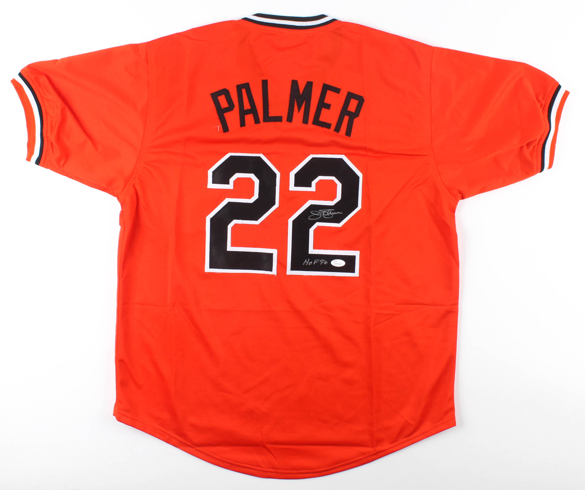 Custom on-field style jersey. Everything sewn on, size XL. Hand-signed and inscribed by Jim Palmer (HOF).