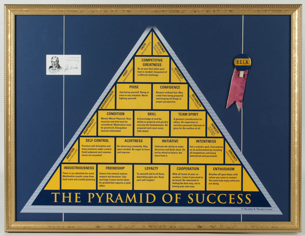 John Wooden Signed "The Pyramid of Success" 23x30 Custom Framed Card Display with Vintage UCLA Pin (PSA COA)
