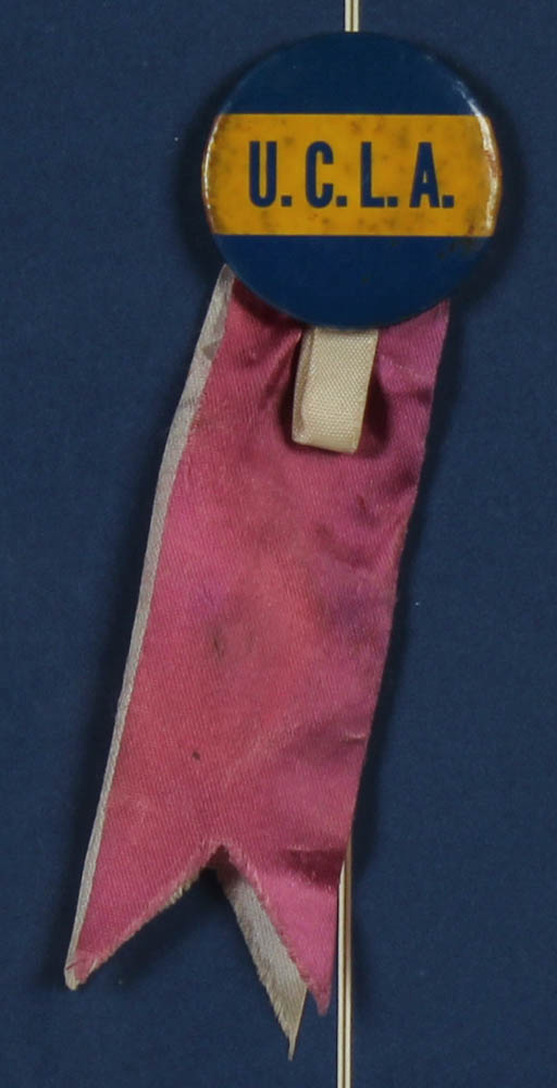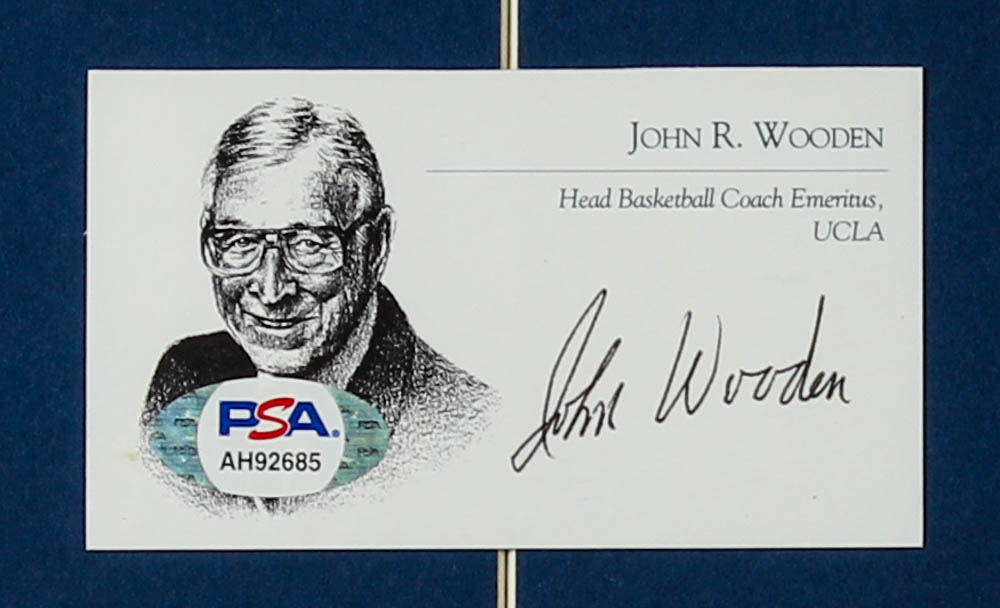Custom framed display measures 23" x 30" in size and features a card that has been hand-signed by John Wooden (D. 2010, HOF). Display also features a vintage UCLA pin.