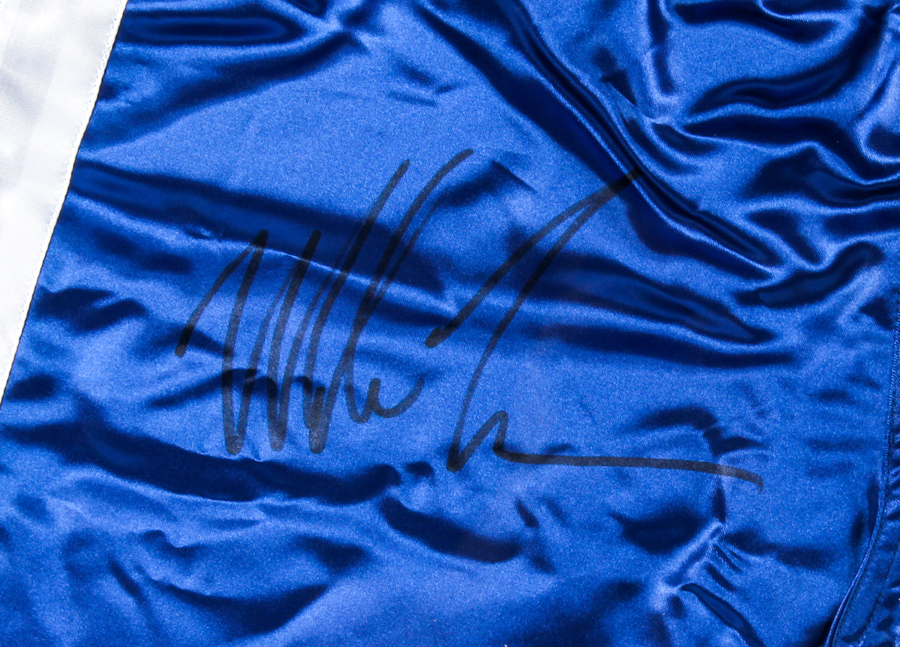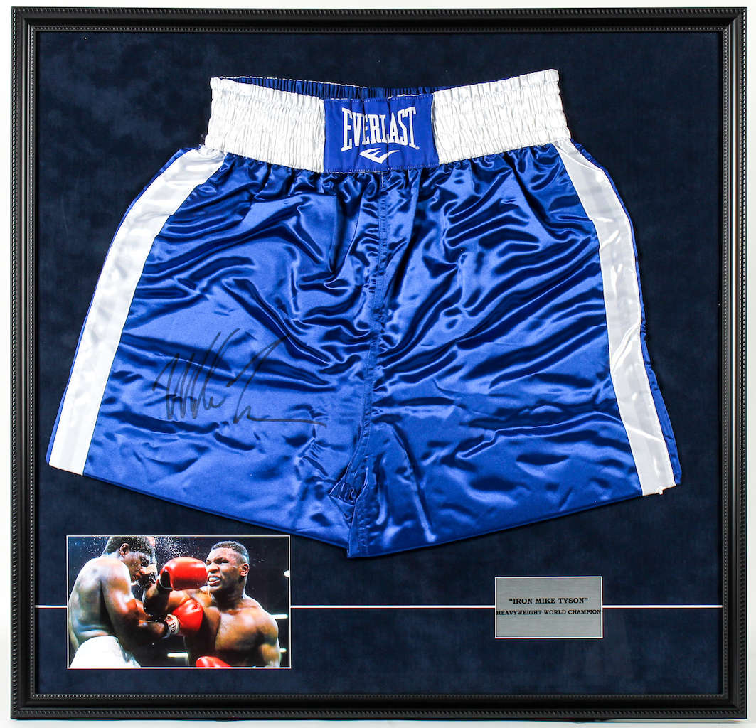 Custom frame measures 30.5" x 32" in size and features a pair of Everlast boxing trunks that have been hand-signed by Mike Tyson (HOF).