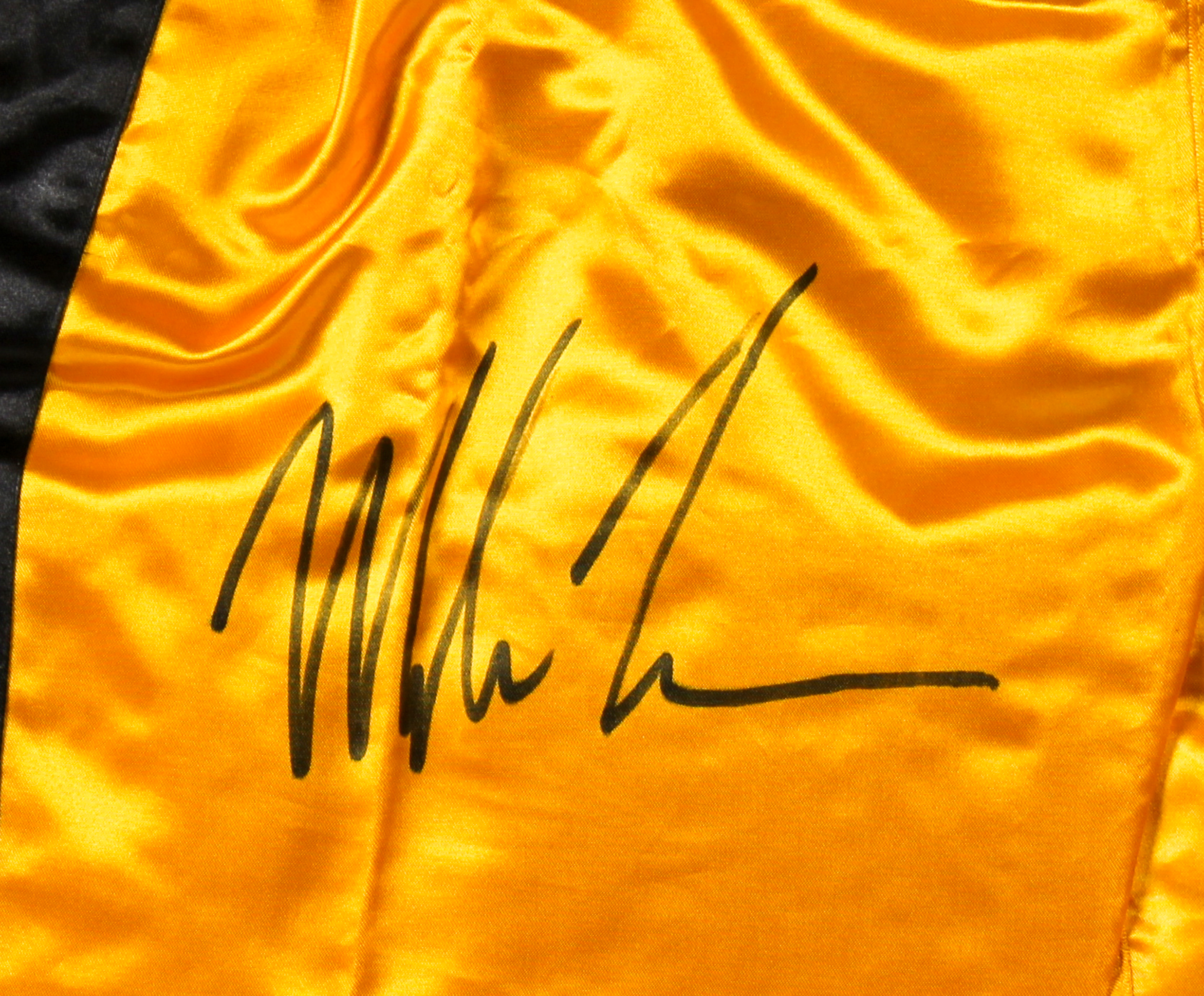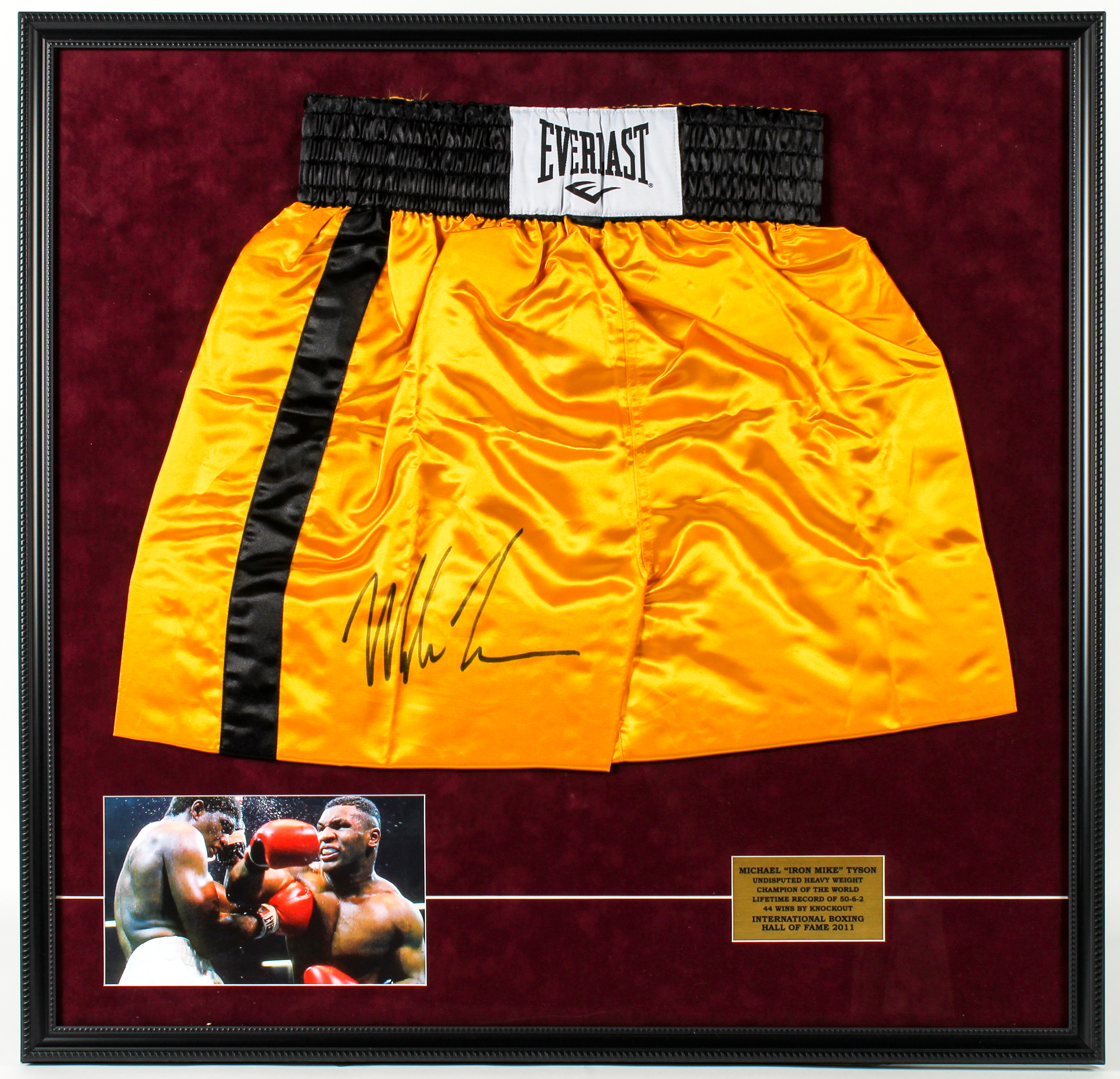 Custom frame measures 30.5" x 32" in size and features a pair of Everlast boxing trunks that have been hand-signed by Mike Tyson (HOF).
