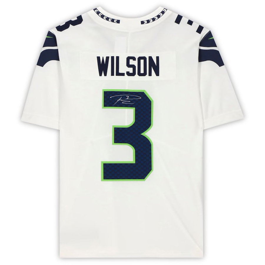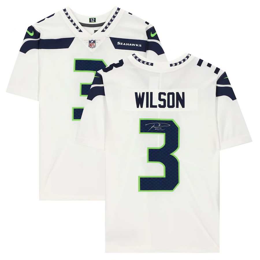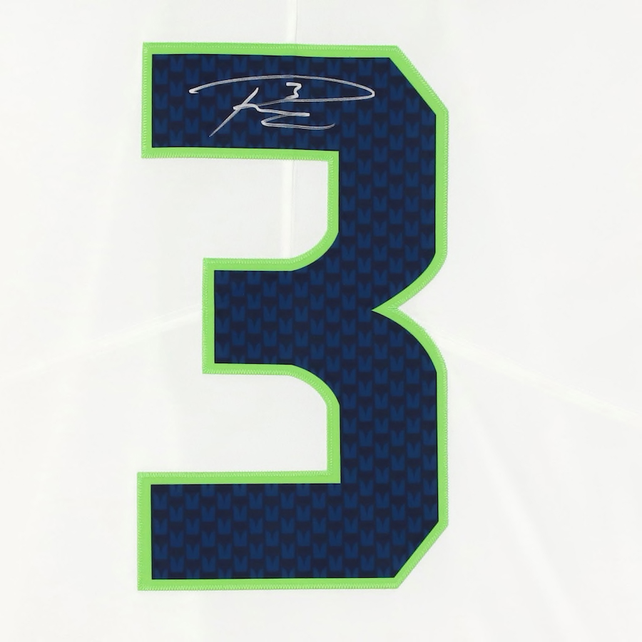 Nike on-field style jersey. Everything sewn on, size L. Hand-signed by Russell Wilson (Seattle Seahawks).