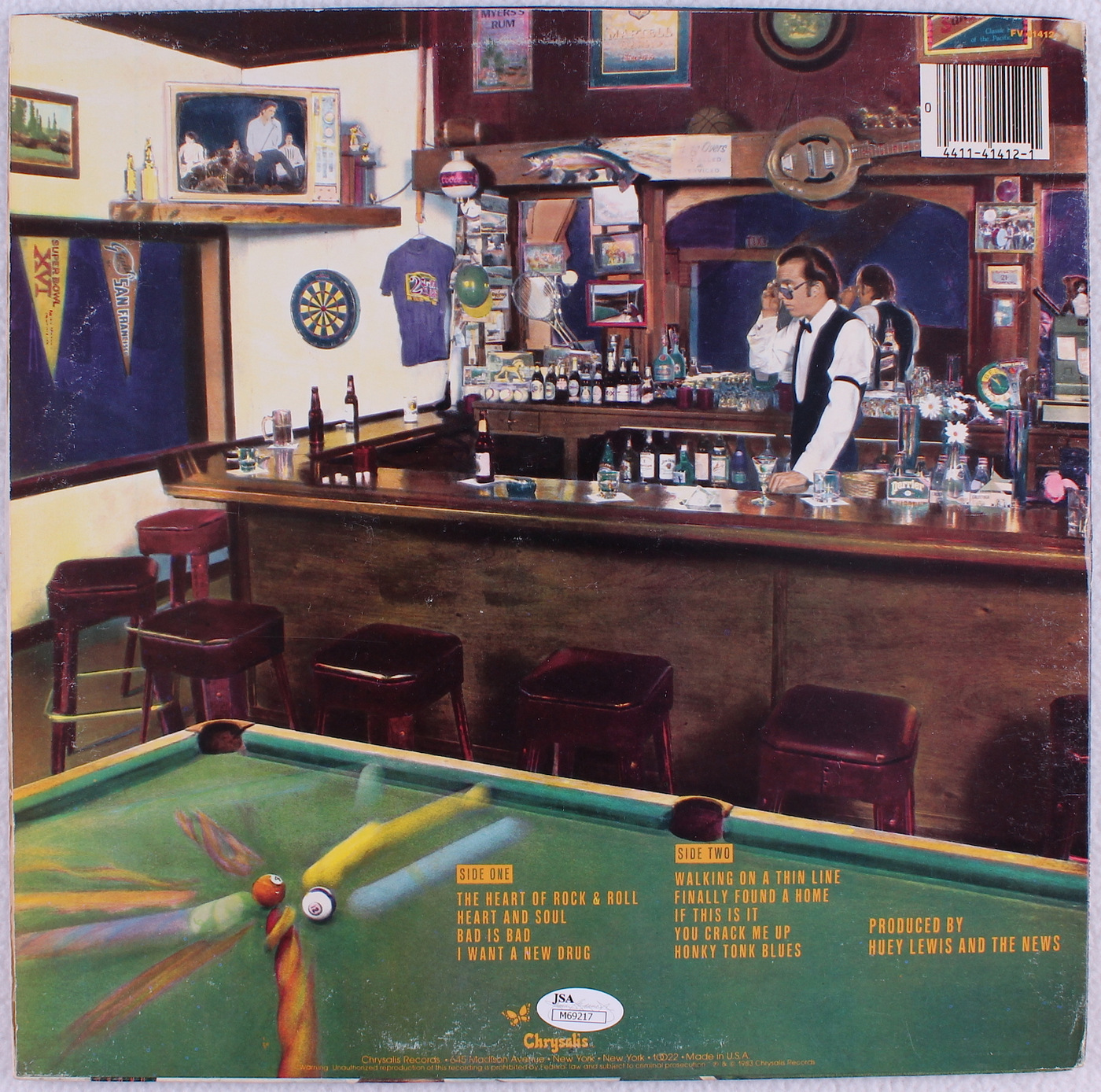 Album cover has been hand-signed in blue felt-tip pen by (4) members of Huey Lewis & The News with Huey Lewis, Johnny Colla, Sean Hopper and Bill Gibson. Please note, the record album is included. The autographs includs an official James Spence Authentication (JSA) hologram and matching COA for authenticity purposes.