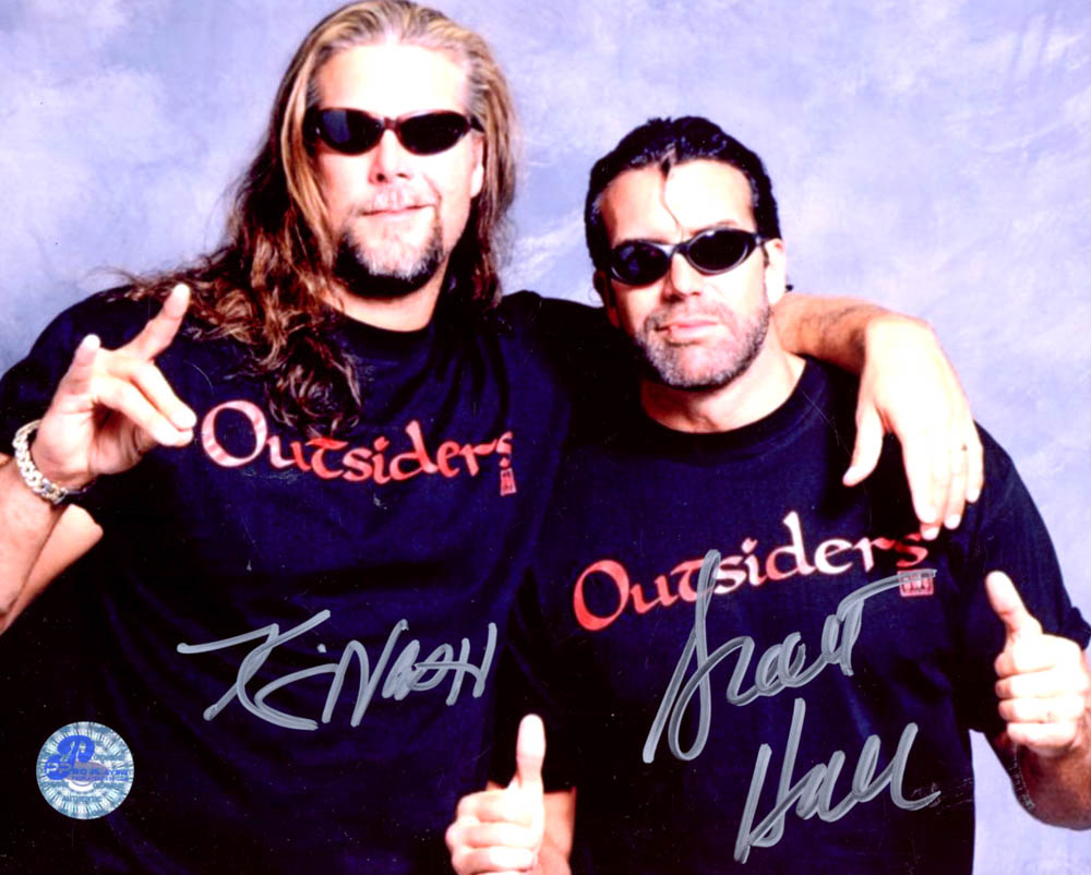 Photo measures 8" x 10" in size and has been hand-signed by Kevin Nash and Scott Hall.