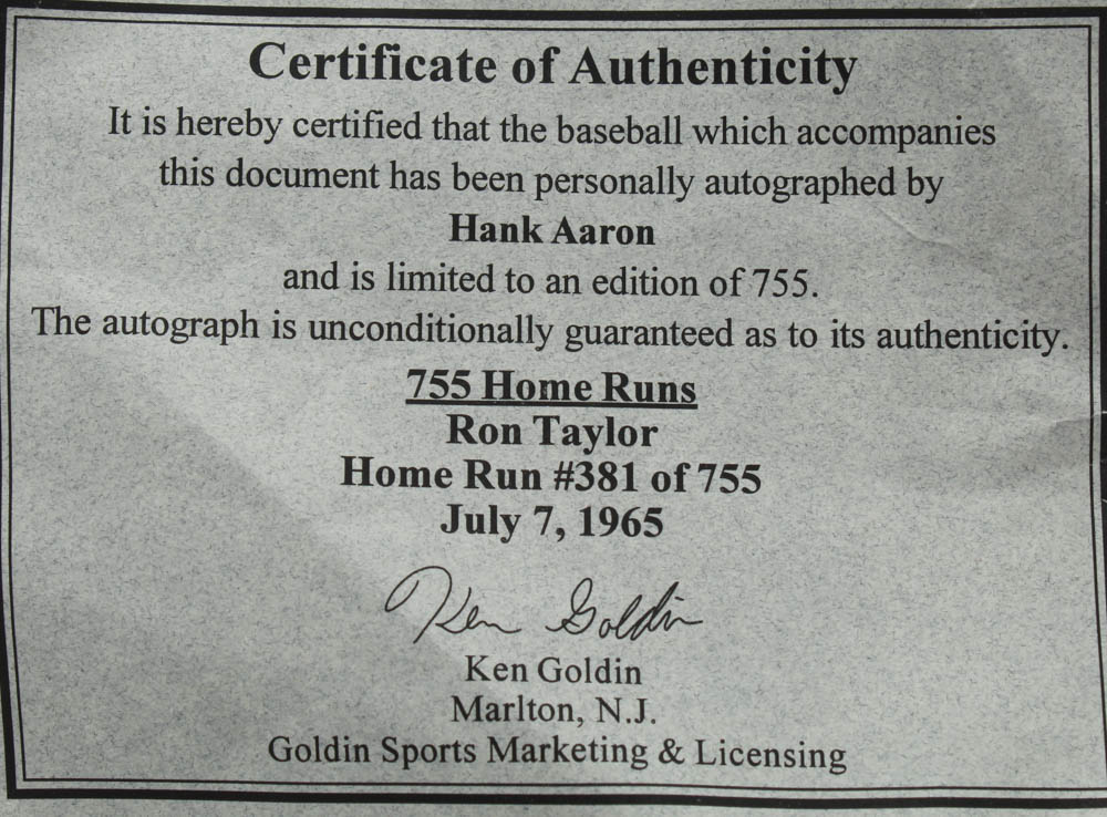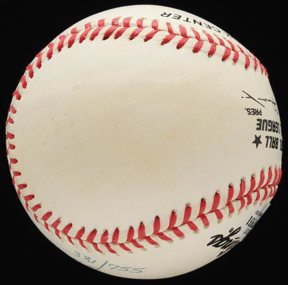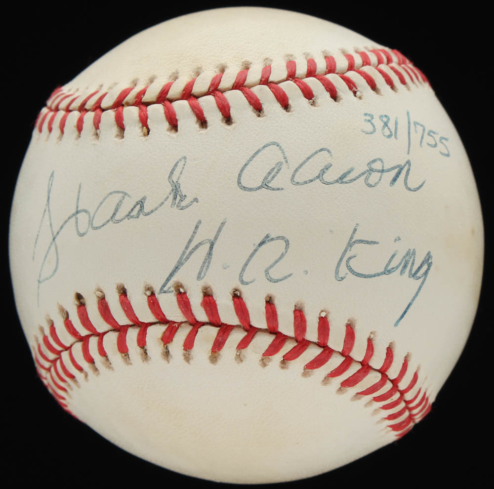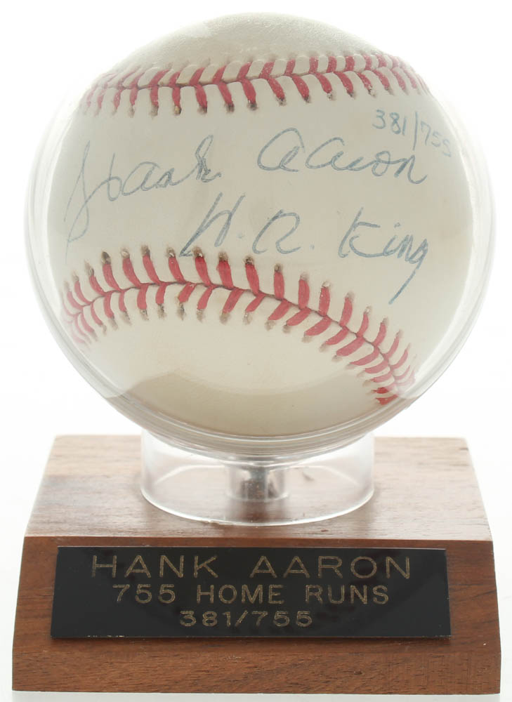 Rawlings Official National League Baseball has been hand-signed by Hank Aaron (Atlanta Braves, HOF). Baseball is limited edition #381/755. Also includes display case as shown.