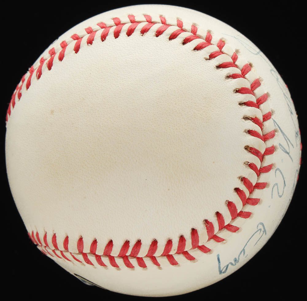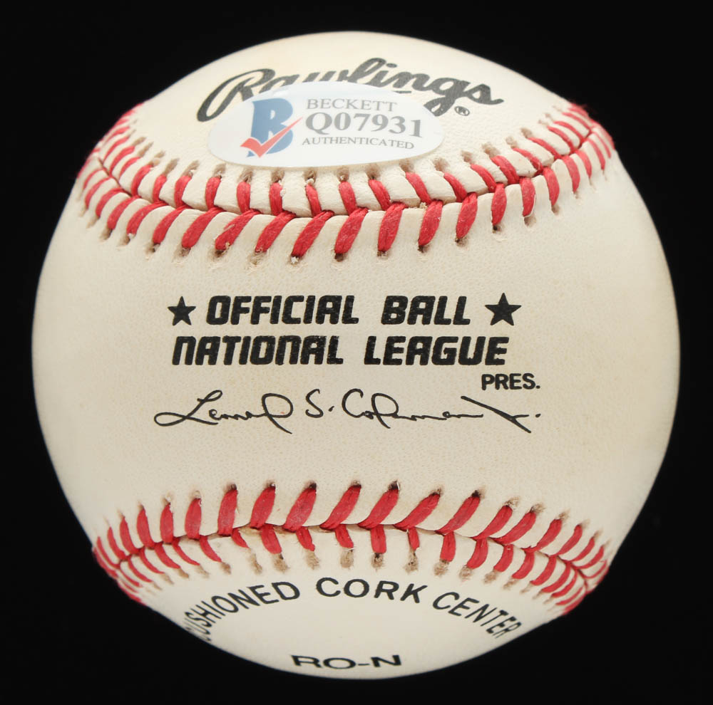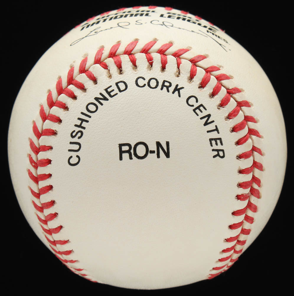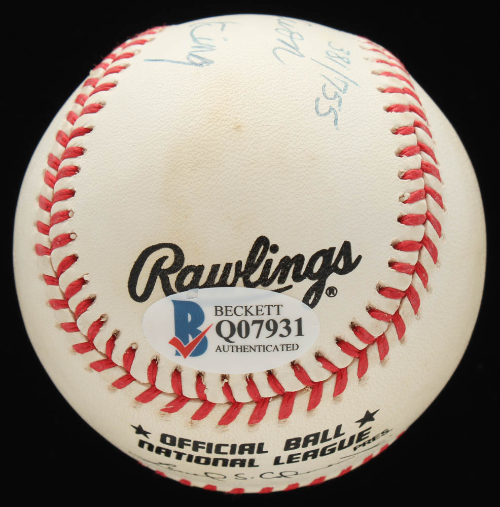 Rawlings Official National League Baseball has been hand-signed by Hank Aaron (Atlanta Braves, HOF). Baseball is limited edition #381/755. Also includes display case as shown.