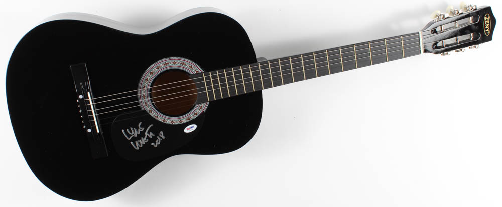 Zeny acoustic guitar measures approximately 38" in length and is hand-signed on the pick guard by Lyle Lovett.