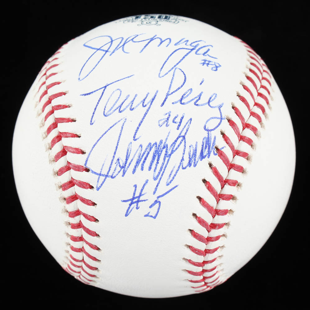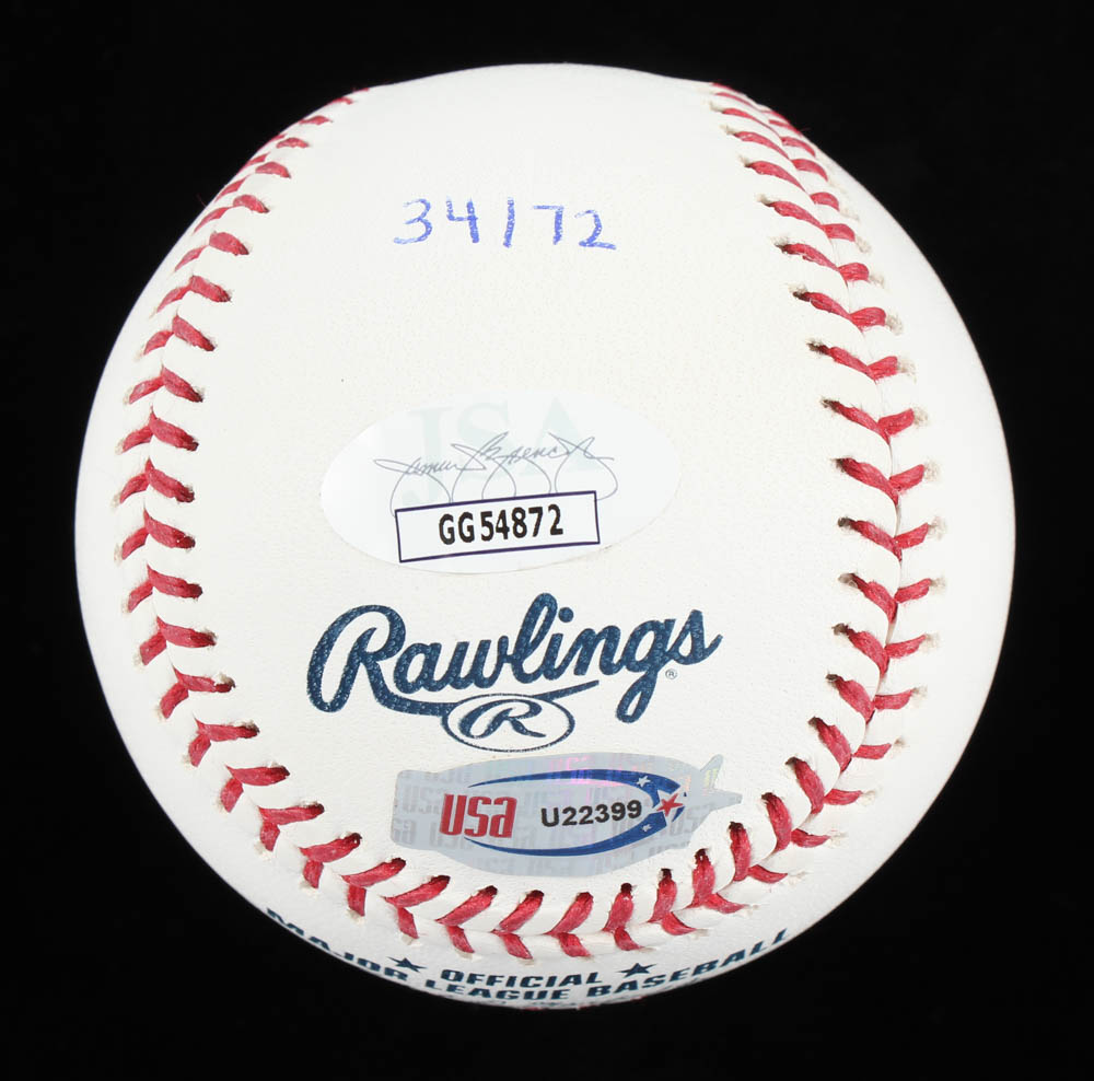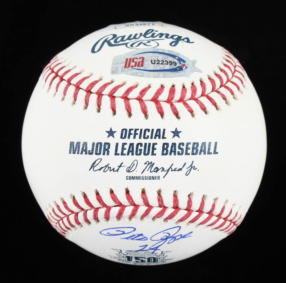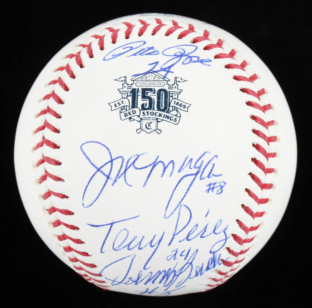 Rawlings Official Major League baseball. Hand-signed by Joe Morgan (D. 2020, Cincinnati Reds, HOF), Pete Rose (Cincinnati Reds), Johnny Bench (Cincinnati Reds, HOF) and Tony Perez (Cincinnati Reds, HOF). Hand-numbered limited edition #34/72.