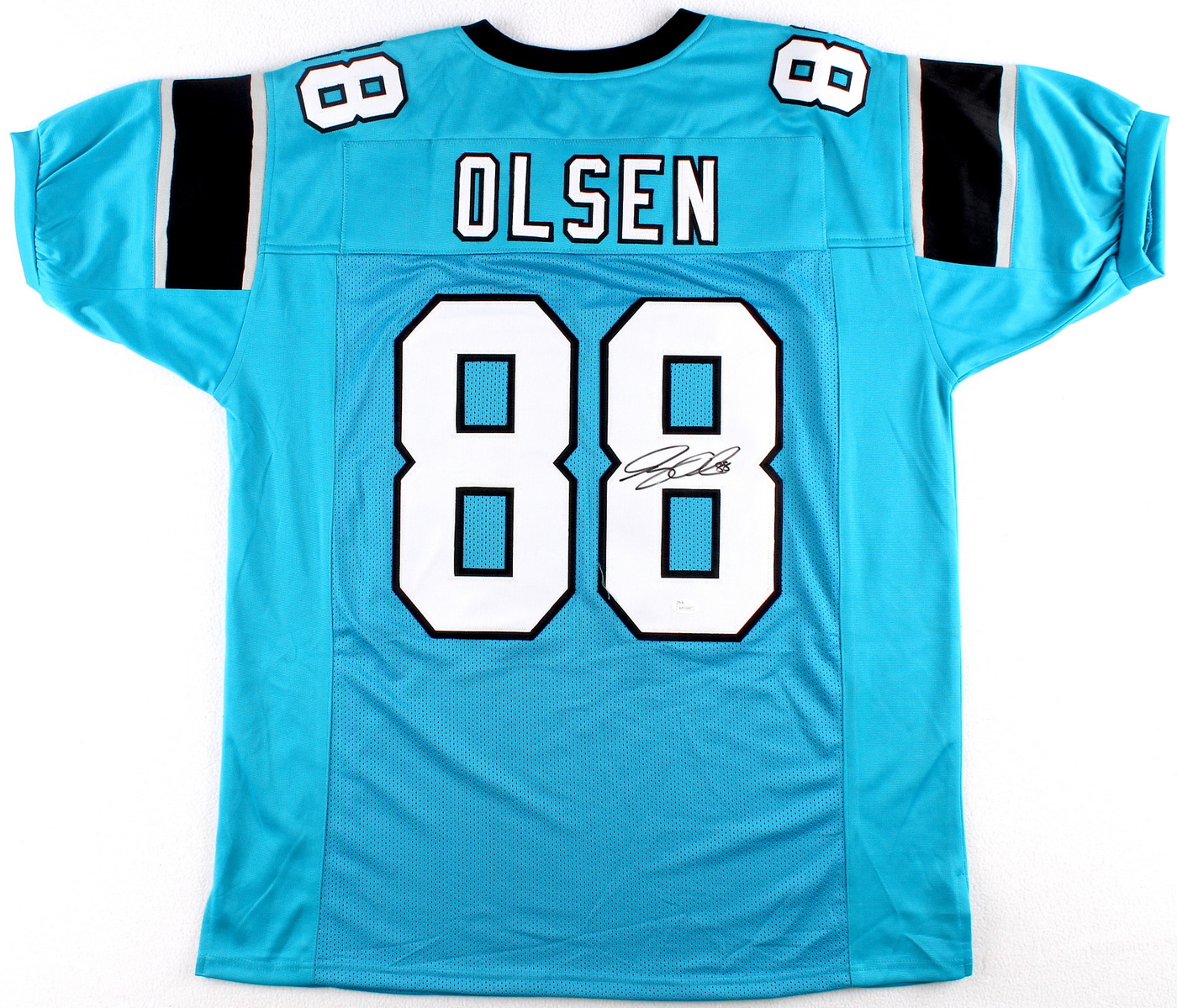 Custom on-field style jersey. Everything is sewn on, size XL Hand-signed in black felt tip pen by Greg Olsen. The autograph includes an official James Spence Authentication (JSA) hologram and matching COA for authenticity purposes. The signing of this item was witnessed by JSA.