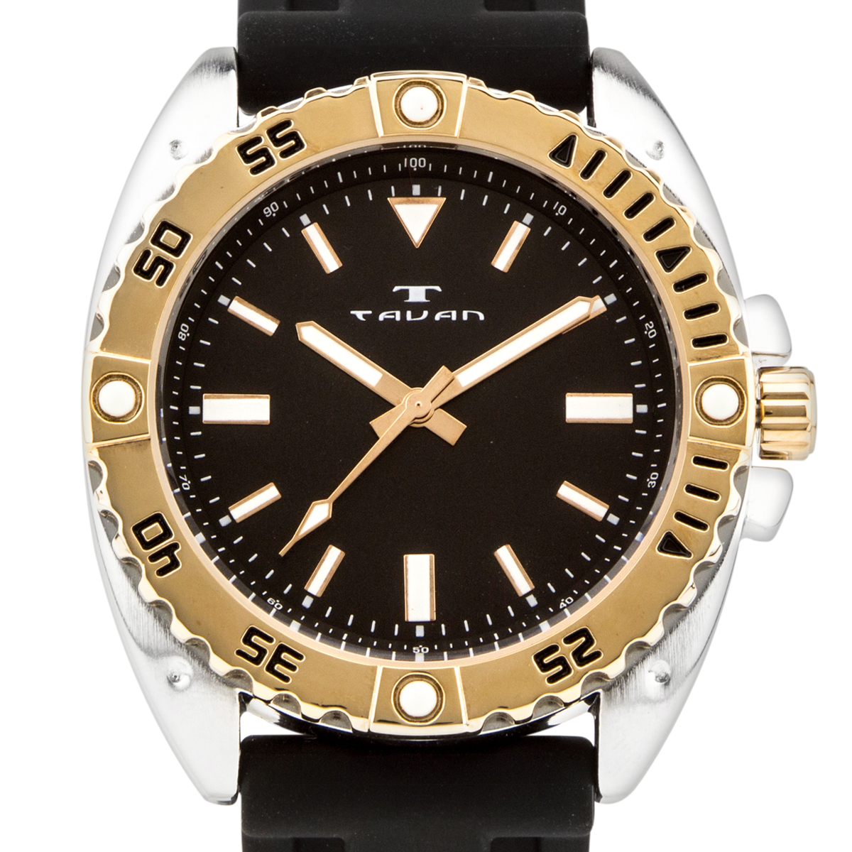 The Tavan Anchor Sentinel Men's Watch features a black silicone strap, silver case, black dial, and rose gold bezel. Please see photos for details.