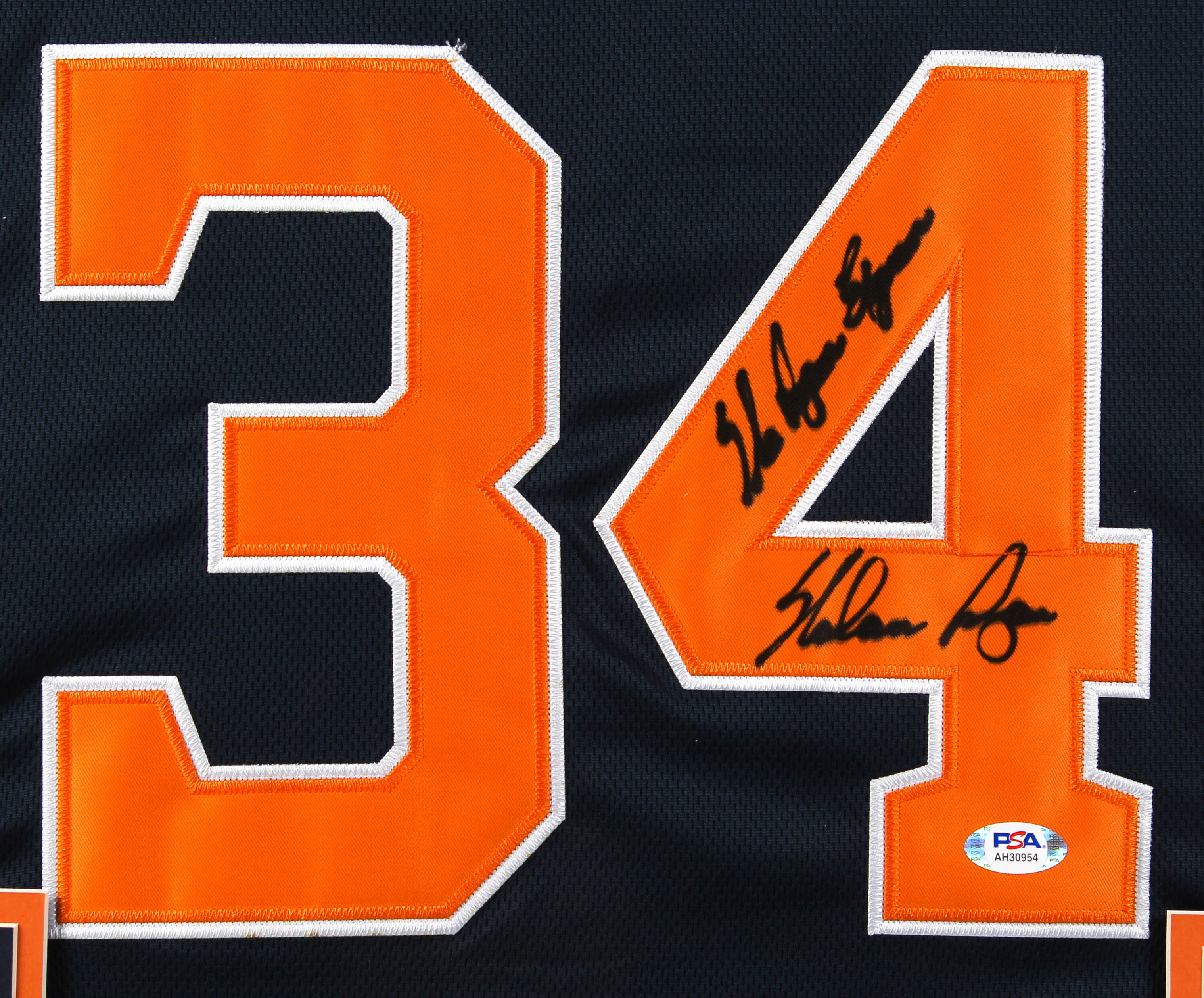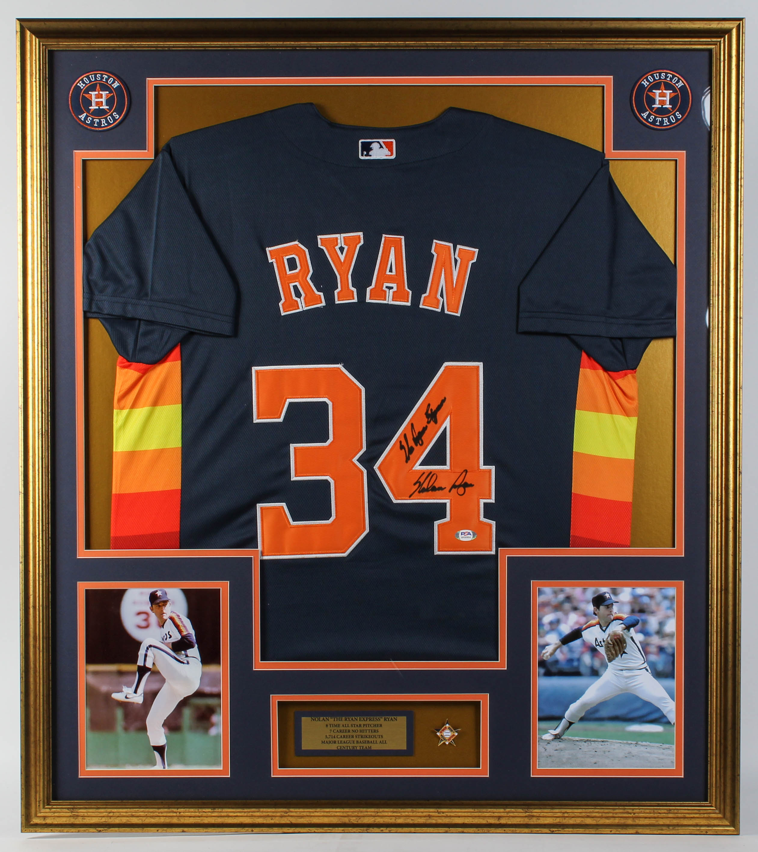 Custom frame measures approximately 33" x 37" in size and features a jersey which has been hand-signed and inscribed by Nolan Ryan (Houston Astros, HOF). Please see photos for details regarding the condition of the frame.