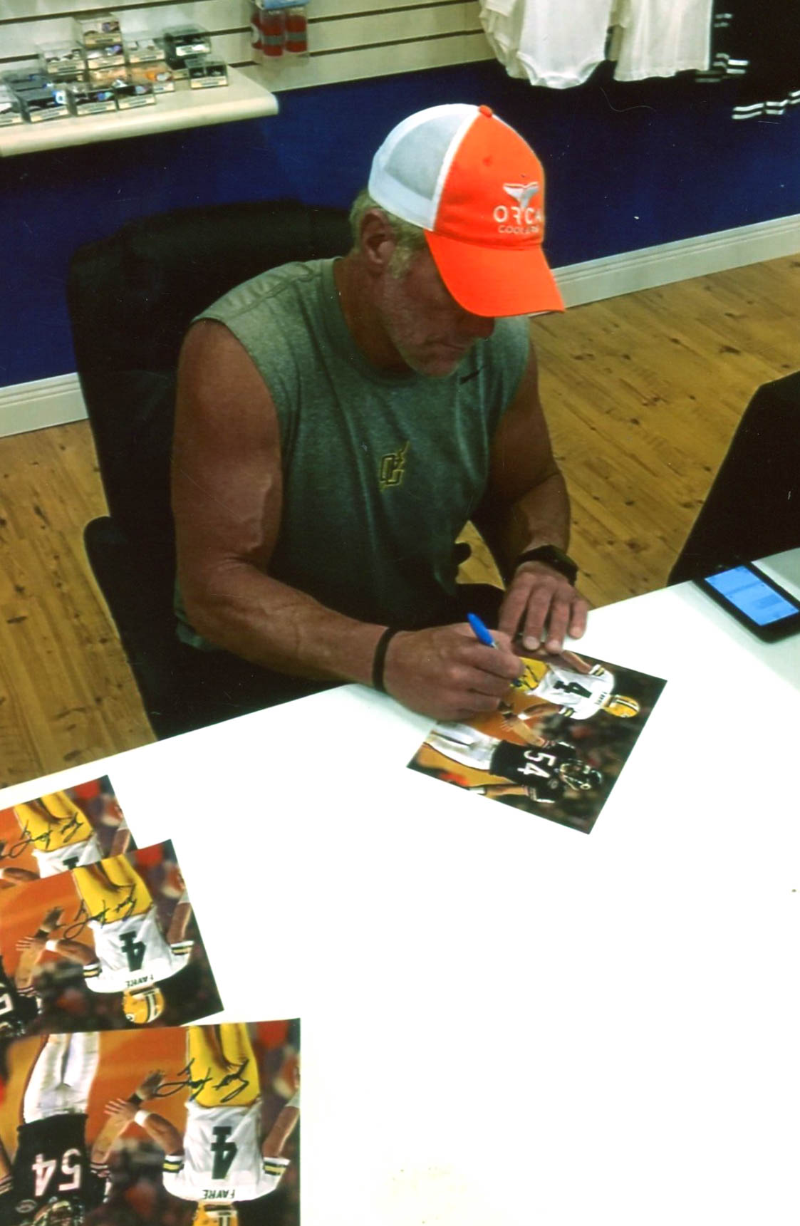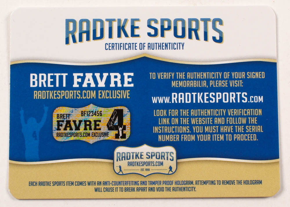 The lot / autograph(s) includes an official exclusive Brett Favre hologram and COA from Radtke Sports. Also includes a proof photo from the signing.